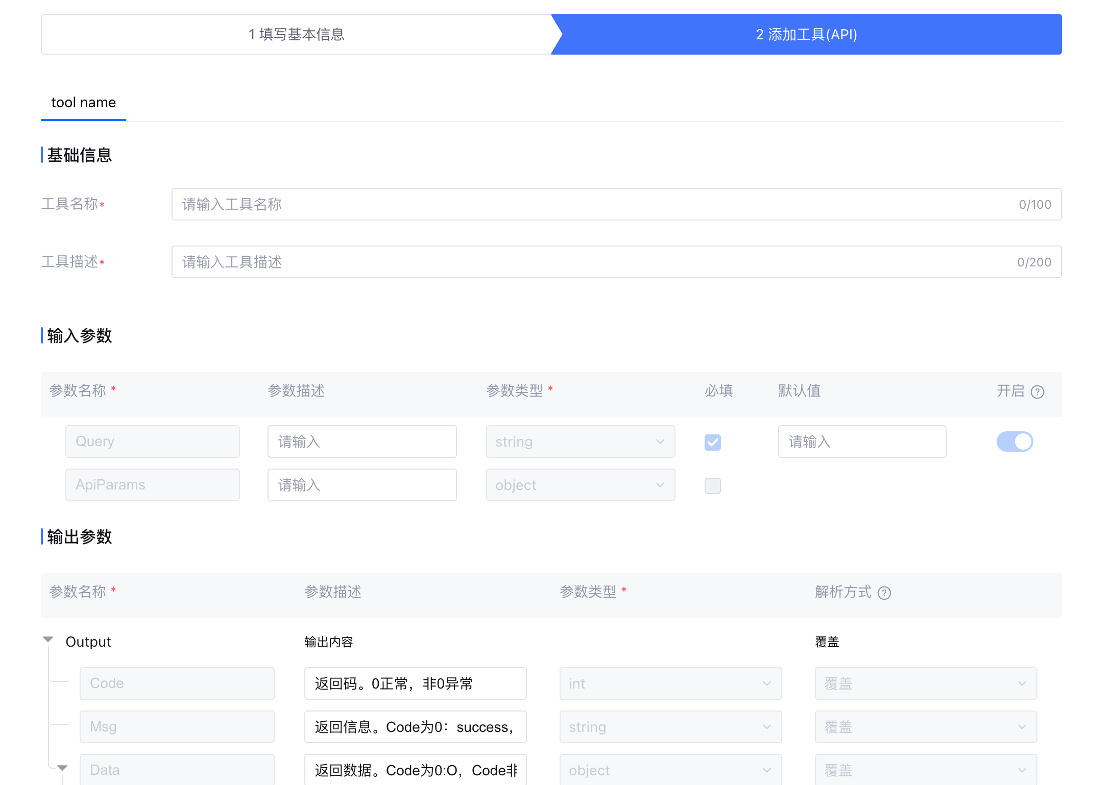 填写工具名称和描述。输入参数中,仅支持编辑参数描述,参数名称和类型不可编辑,对于单工作流模式应用,输入参数为工作流开始节点的输入参数,输出参数为工作流结束节点的输出参数。