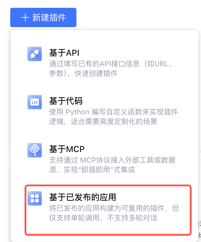 进入插件广场,单击自定义插件 > 新建插件,选择基于已发布应用 。