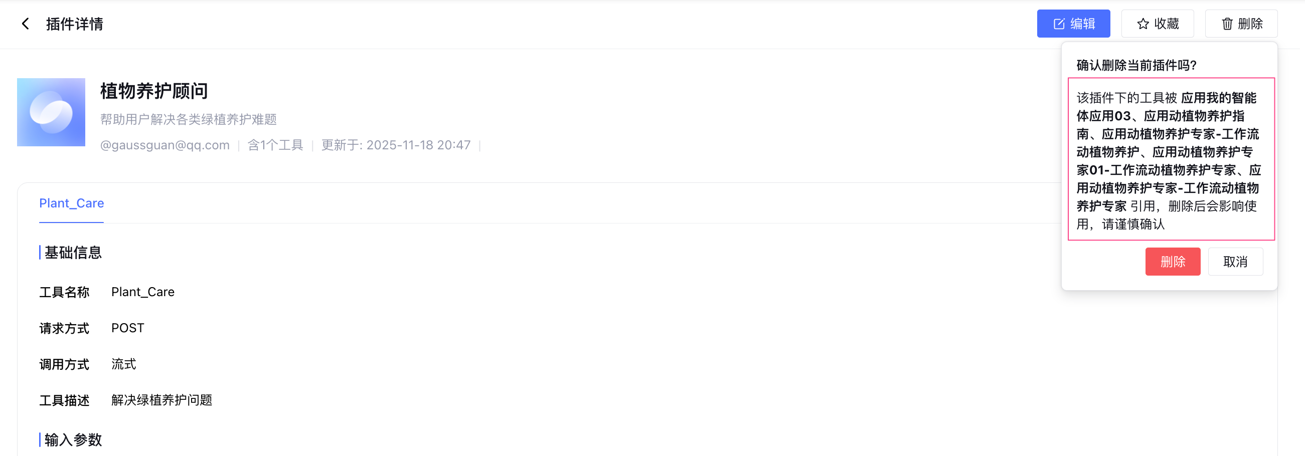 填写成功后,单击保存,新建成功。可在工作流内或 Multi-Agent 模式下添加插件并使用插件,详情请参见 使用插件。 5. 删除插件