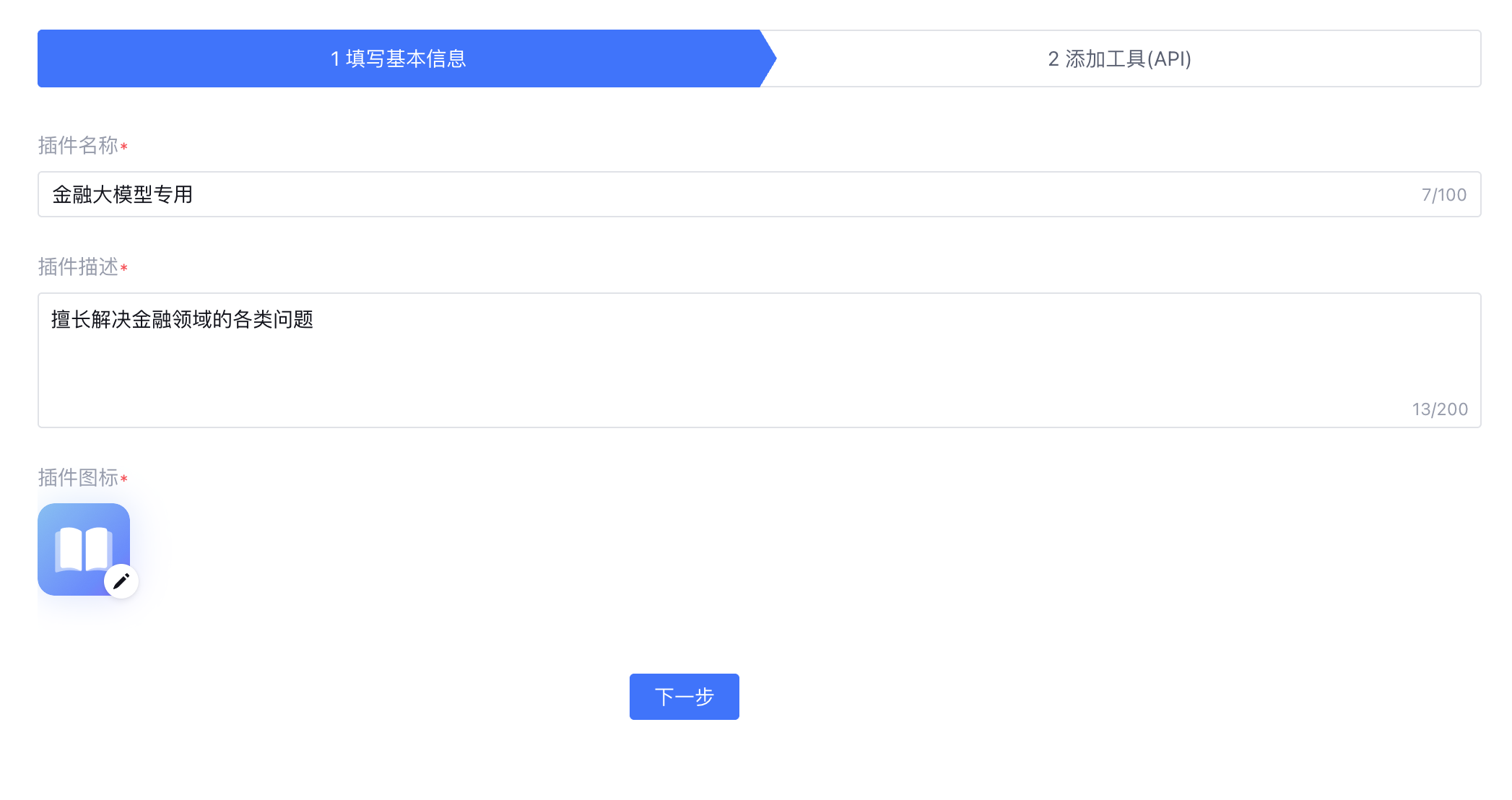 填写基本信息,可编辑插件名称、插件描述和插件图标,默认展示应用名称、应用描述和应用头像,支持用户修改。