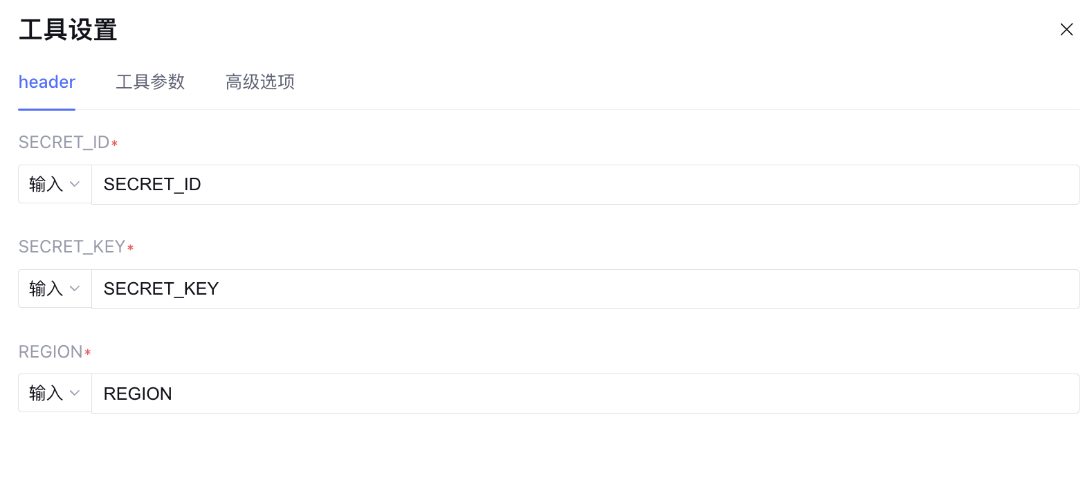部分工具在添加时需要设置SECRET_ID,SECRET_KEY和REGION等密钥信息,在工具设置 > header 中可以对密钥信息进行修改。