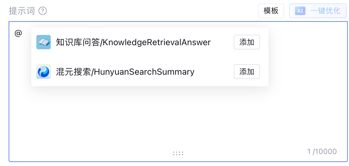 让 LLM 提前了解各个插件的功能介绍与具体作用有助于正确调用插件工具。在应用的提示词中,支持通过快捷键“@”快速插入已选择的工具,同时还可以增加对于工具调用的描述说明,例如在何种情况下调用当前工具,提升大模型对于工具的调用效率。