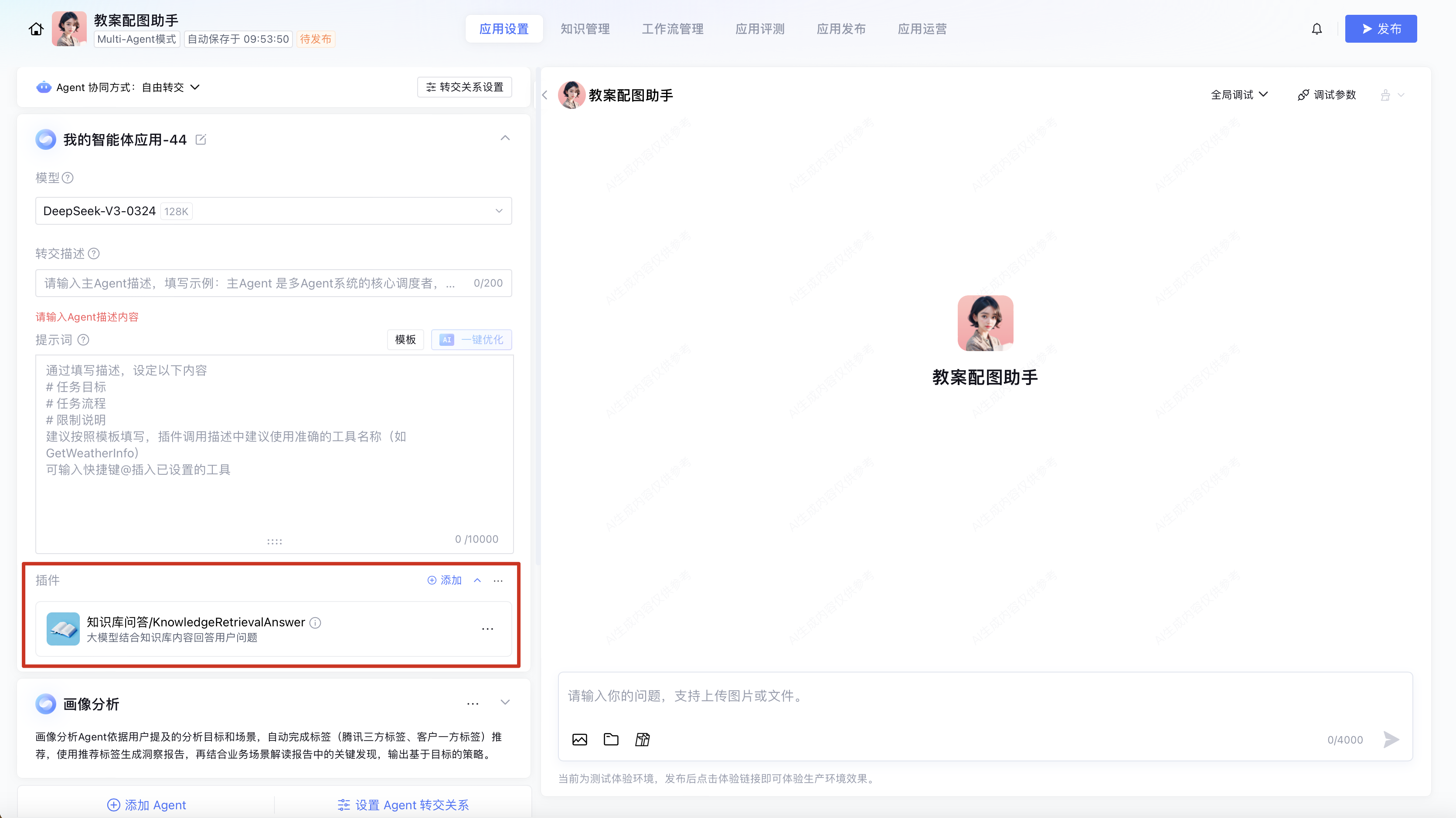 Multi-Agent:在应用设置页添加插件功能,为智能体启用外部能力。