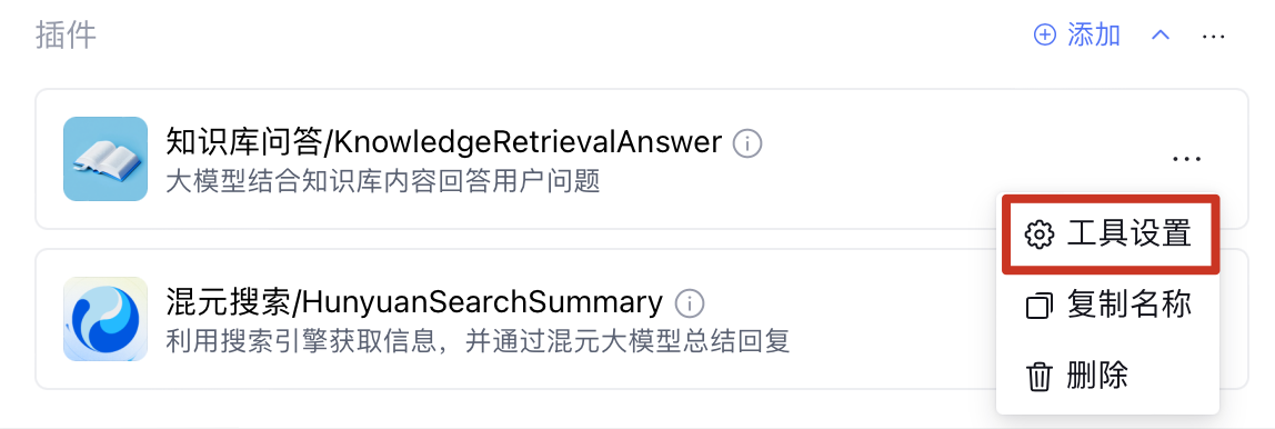 在插件框内,点击所选工具右侧的菜单按钮,例如调整工具设置、复制插件名称或删除插件。