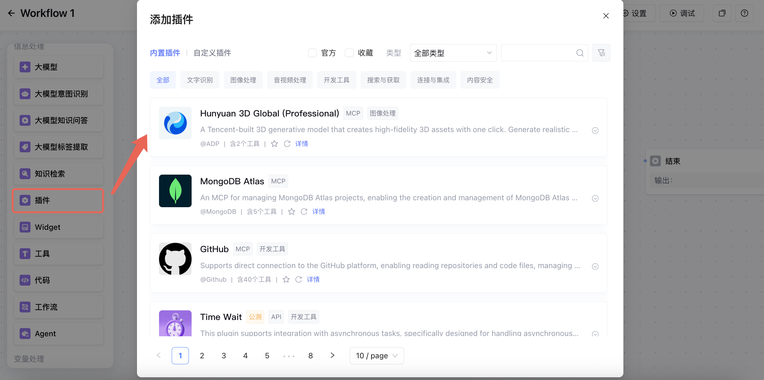 工作流:在某个工作流画布内添加插件节点,随后在标准模式应用内选择该工作流。或在单工作流模式下运行该工作流画布。