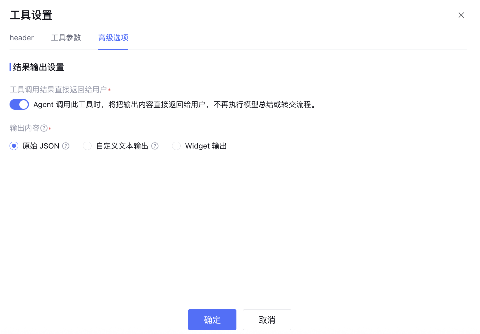 在工具设置 > 高级设置中,可以配置结果输出设置:当开启时,工具结果会直接返回给用户,不再进入模型总结、改写或转交流程。支持选择以下输出结果格式: