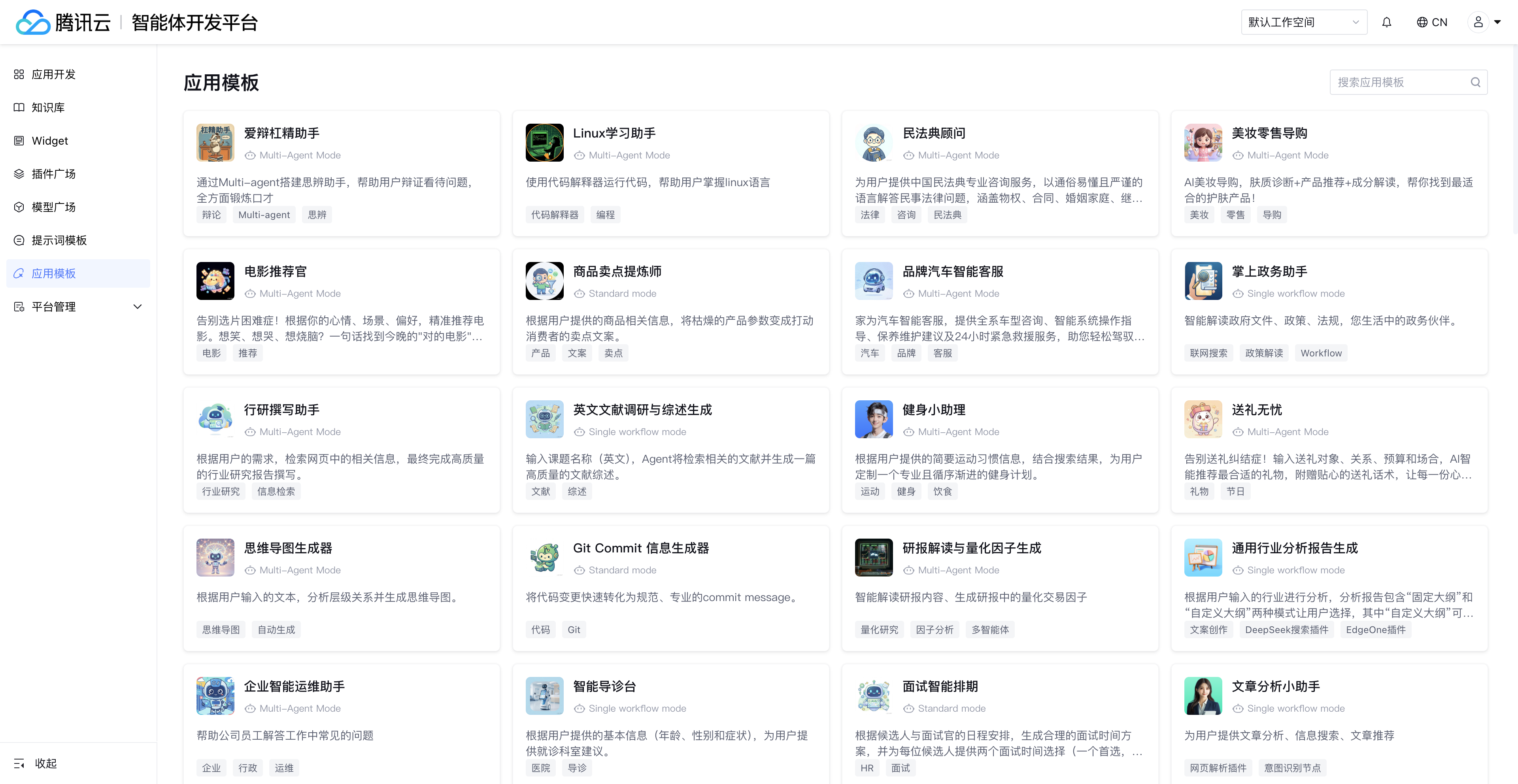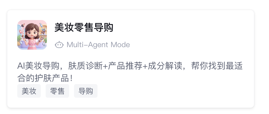 应用卡片展示应用的头像、名称、应用模式、应用描述、应用强化信息。其中,应用强化信息帮助用户初步了解该应用模板要点,便于直观理解和筛选应用。