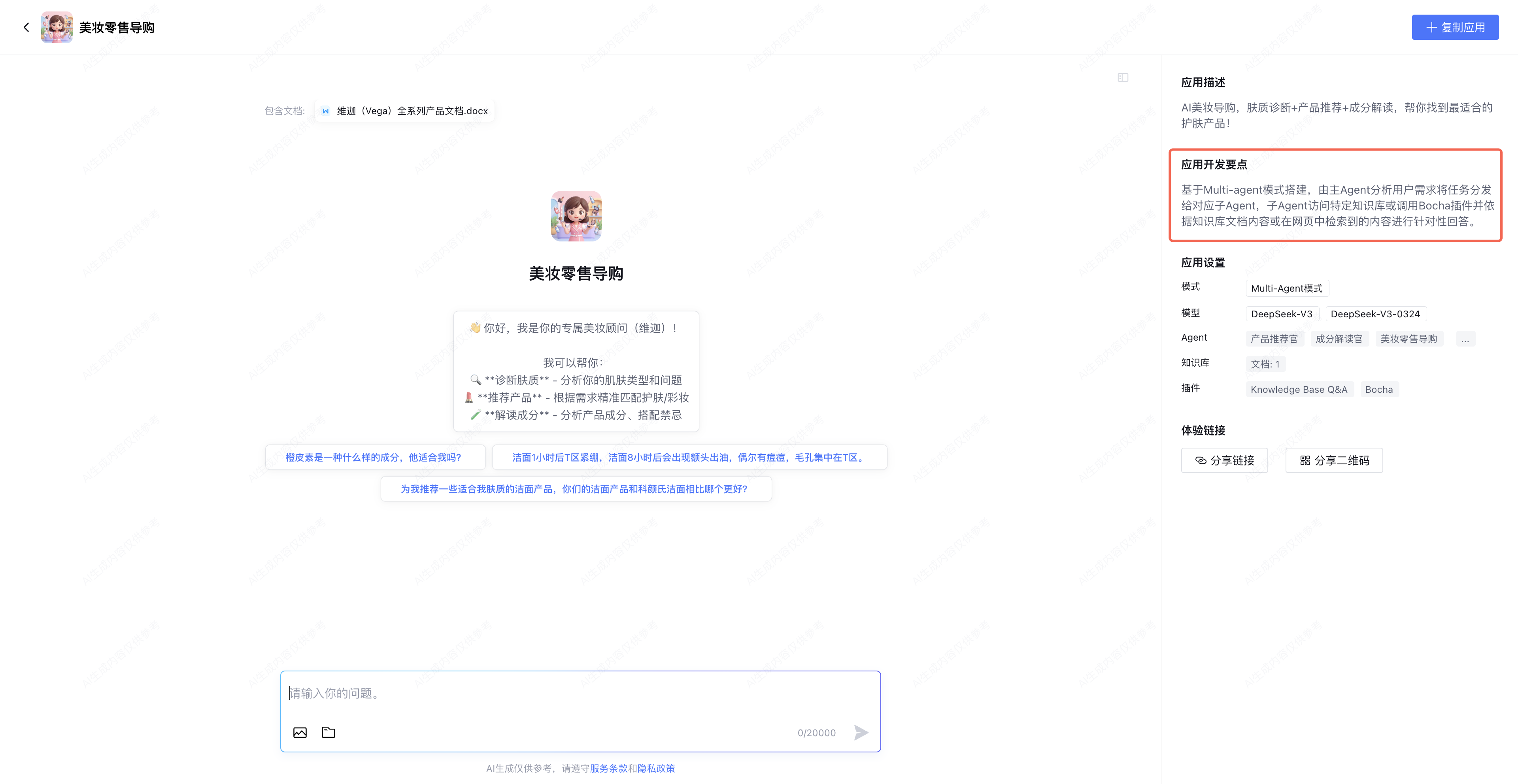 单击应用卡片进入应用模板体验界面,支持点击推荐问题或输入问题体验应用效果。