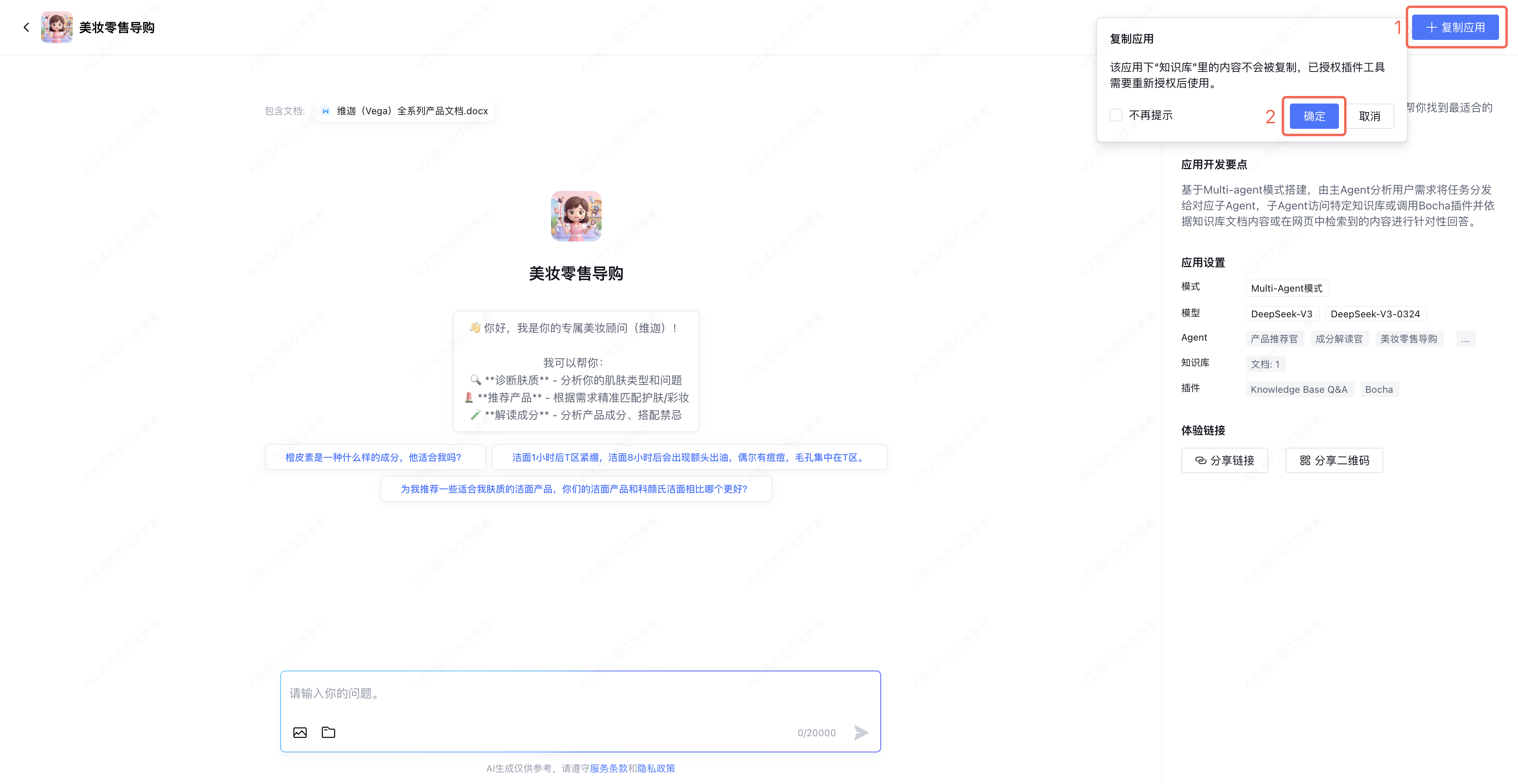 该应用下“知识库”里的内容不会被复制,已授权的插件工具需要重新授权后使用。