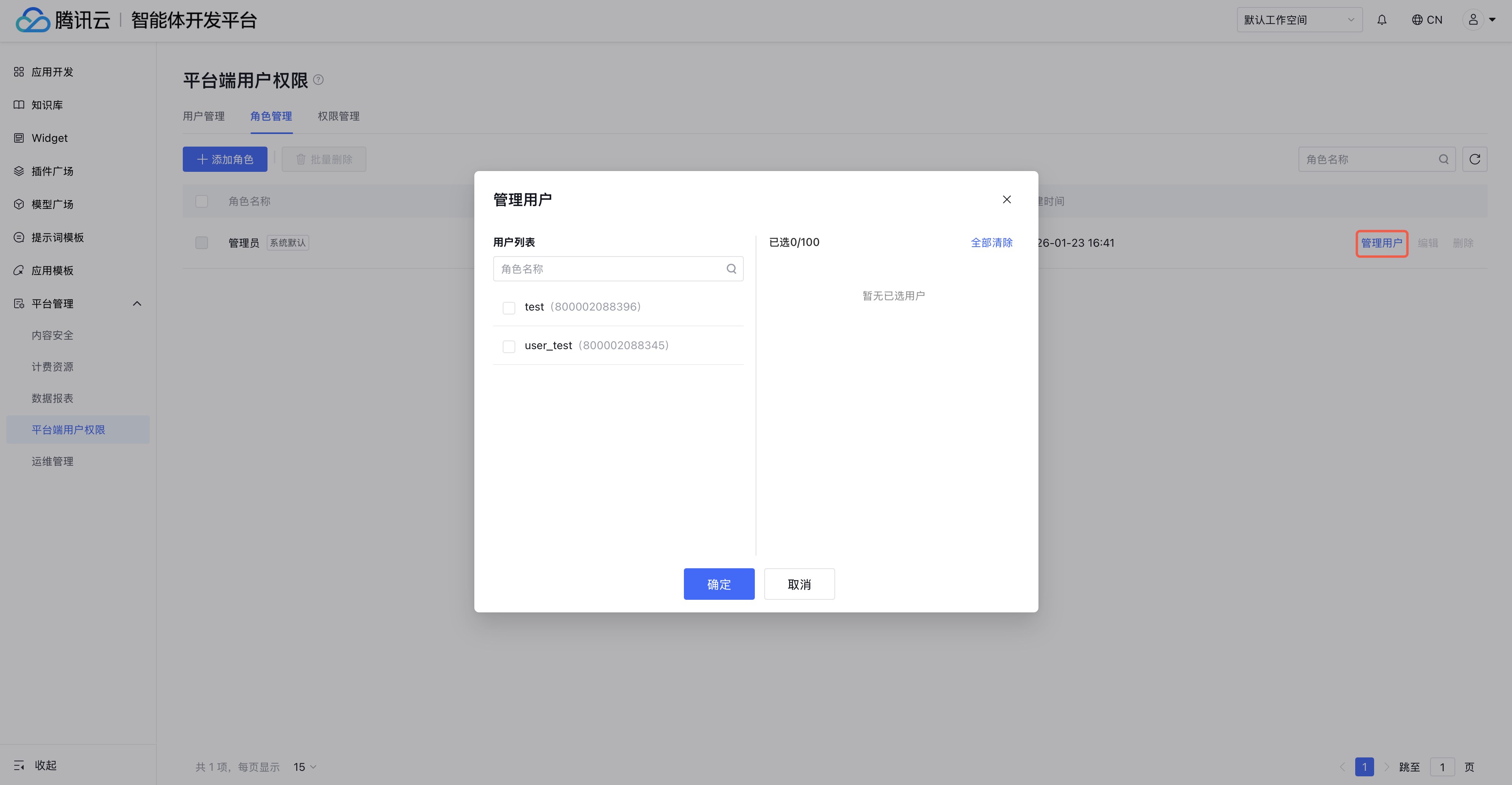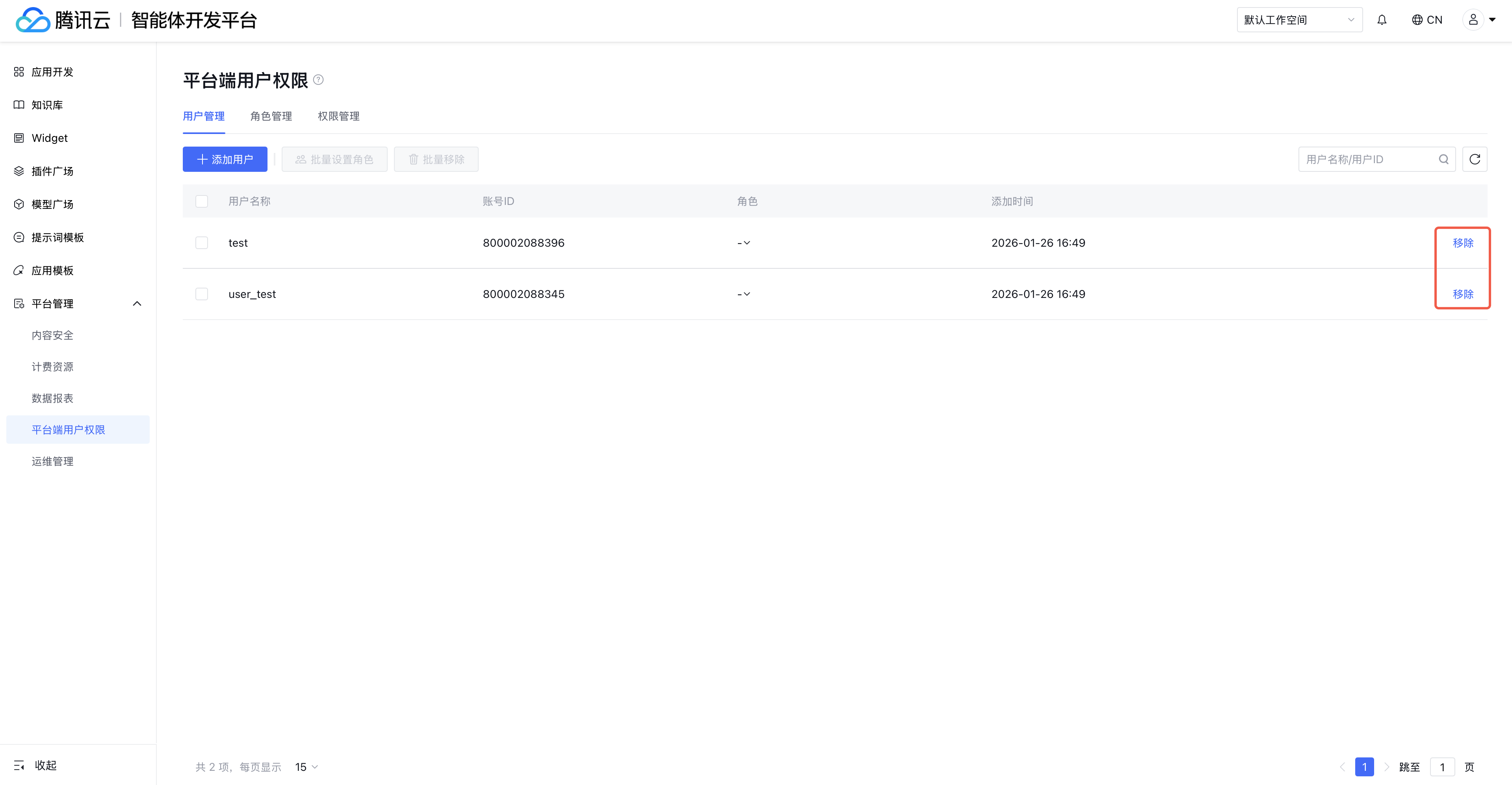 管理用户:支持从角色中添加/移除用户,仅支持添加当前空间成员;移除用户后,当前用户将不再拥有角色的权限。