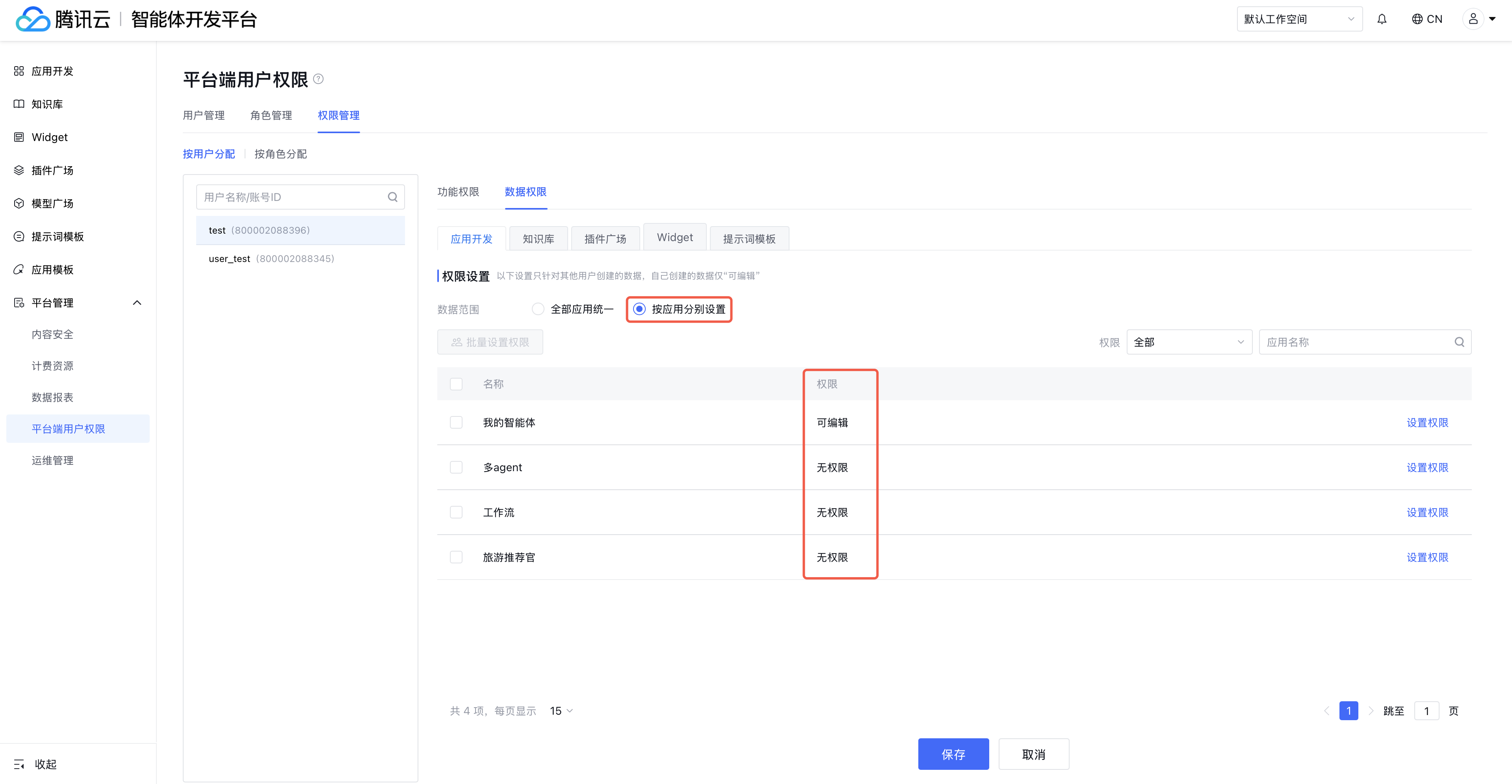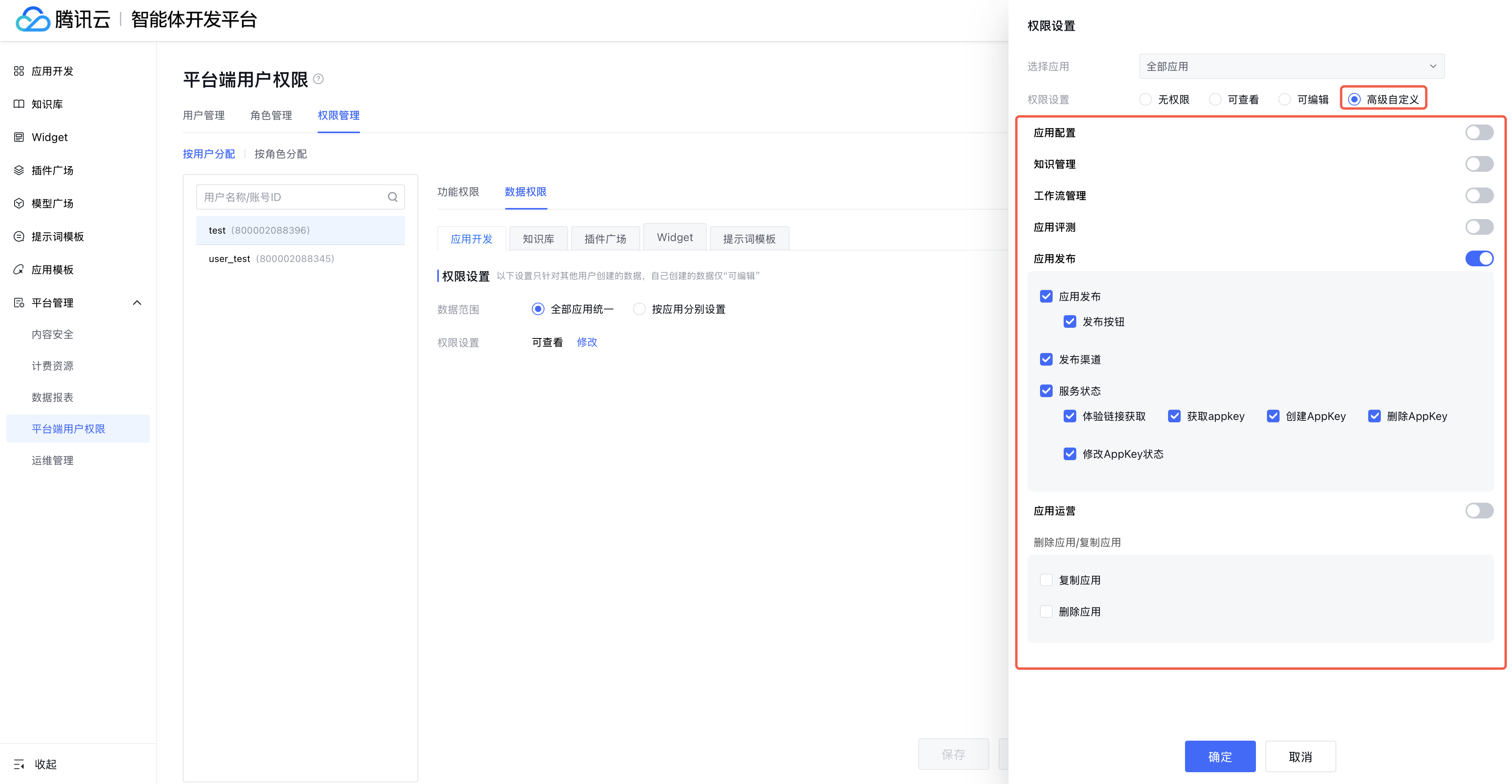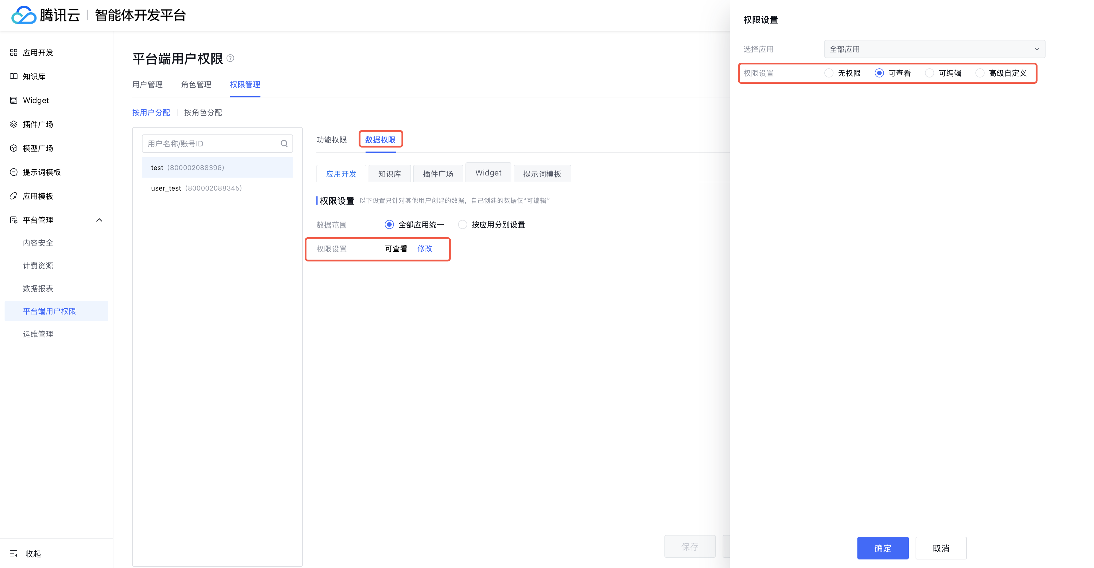 数据权限:管理空间成员可以在当前空间查看、编辑哪些数据。目前产品上支持按照应用、知识库、插件和提示词模板设置数据权限,支持设置无权限、可查看、可编辑、高级自定义权限配置。