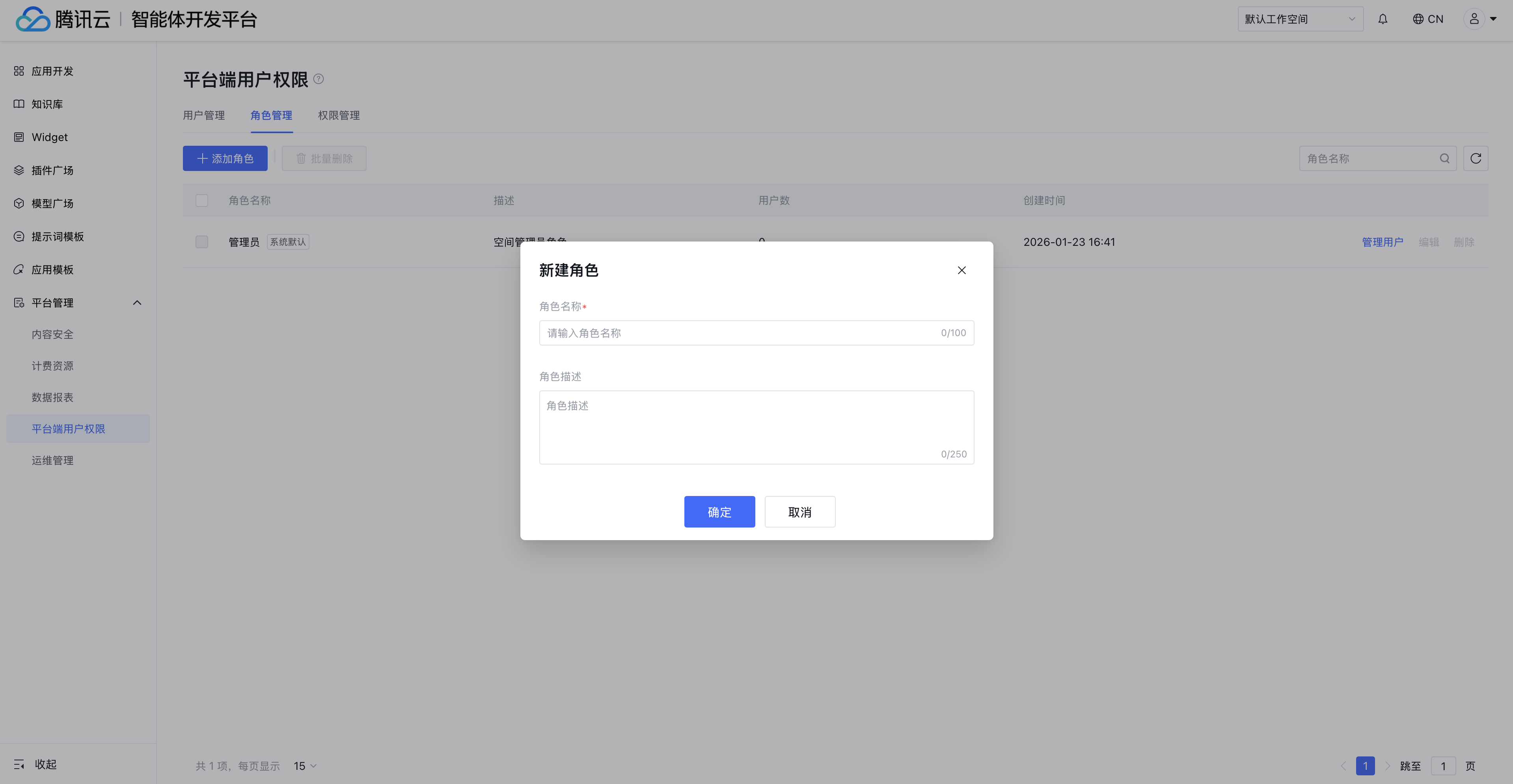 智能体开放平台 | 应用开发 | 新建应用 | - | 超级管理员、管理员(当前空间) 、首次添加到空间的成员。