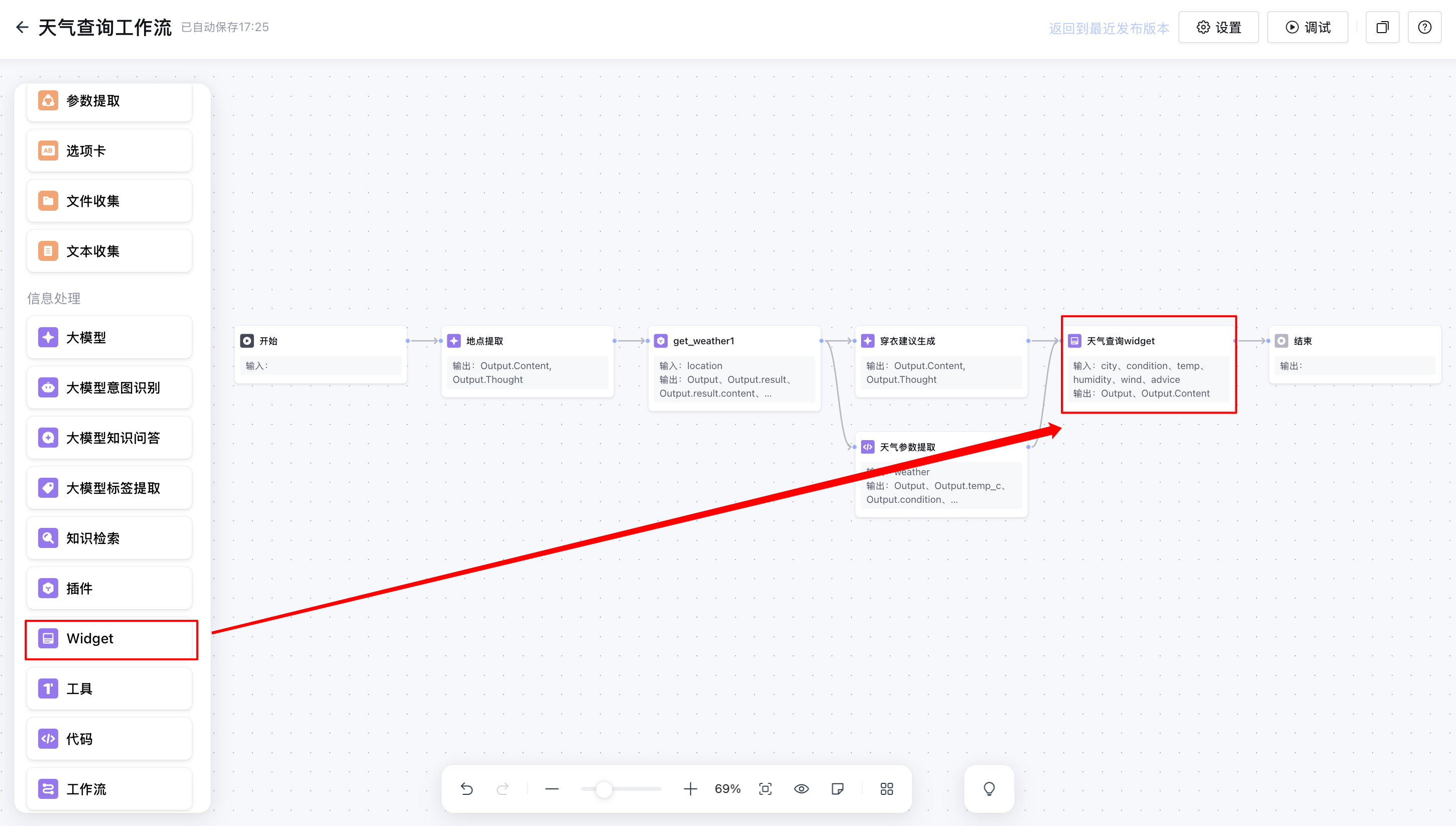 在配置 Widget 节点时,请确保上一节点输出的数据结构与 Widget 所需的输入变量格式一致。数据格式不匹配将导致无法正常渲染。