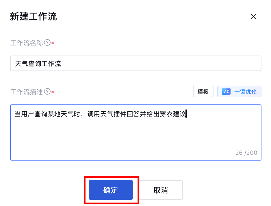 2. 在工作流管理页面,输入新建工作流的名称和描述,单击确定。