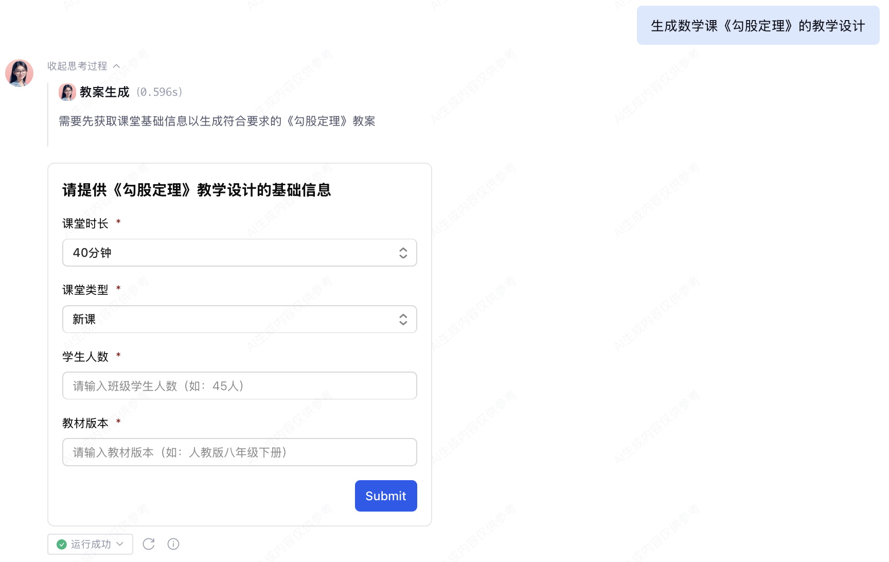 用户发起请求:生成数学课《勾股定理》的教学设计。
