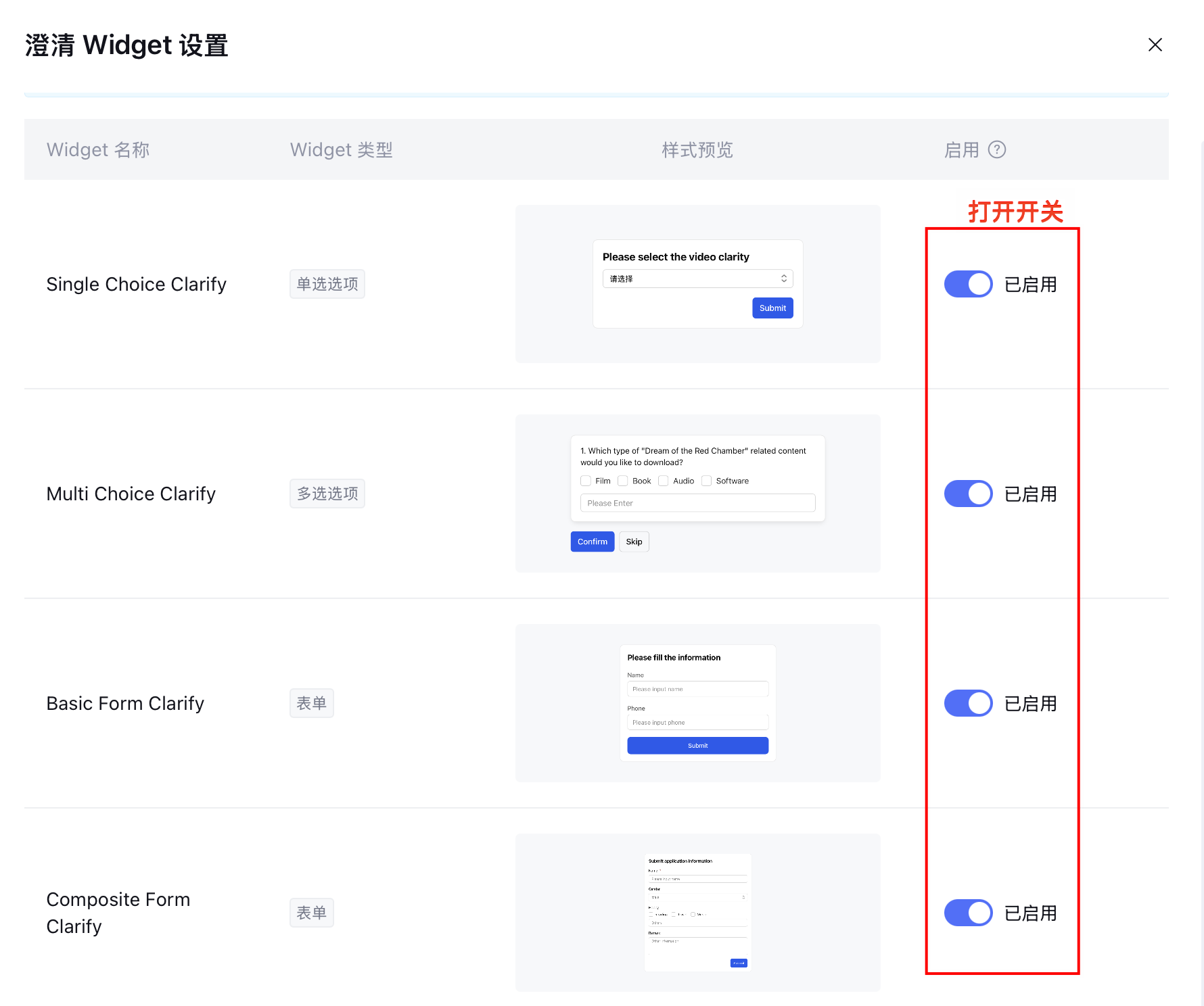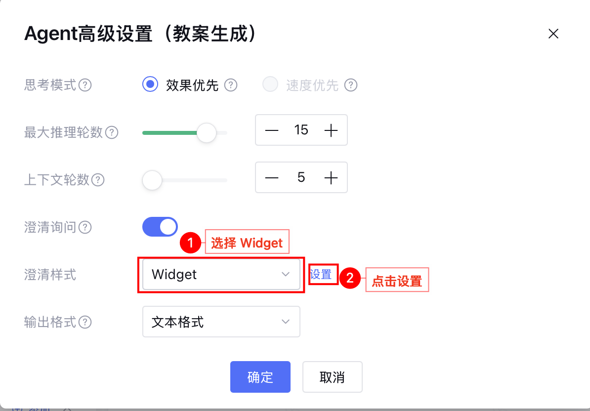 3. 打开开关启用澄清 Widget,允许开启多个,模型会根据理解输出最合适的 Widget,完成设置。