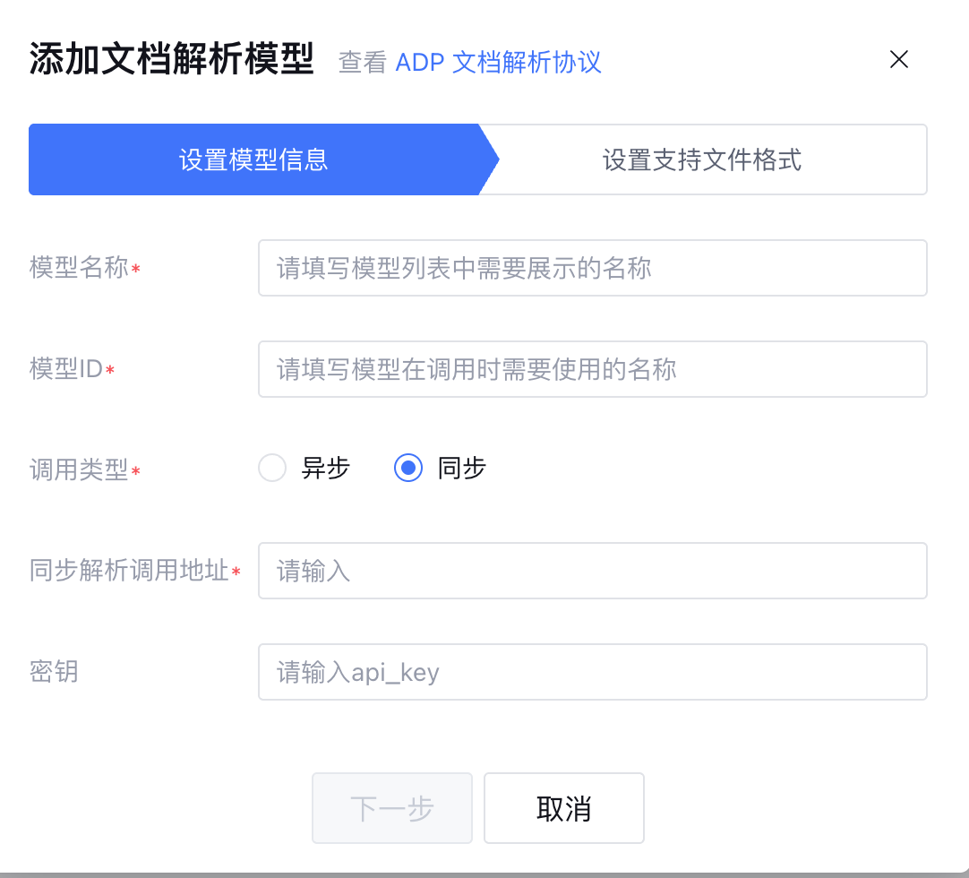 您需按照 ADP 文档解析协议,进行服务封装。服务封装完成后,方可通过 ADP 界面自定义完成服务添加。 在 ADP 文档解析中单击添加,填写相关信息,即可完成接入,其中模型名称、模型ID由您自定义命名,用于调用过程中的唯一性校验。