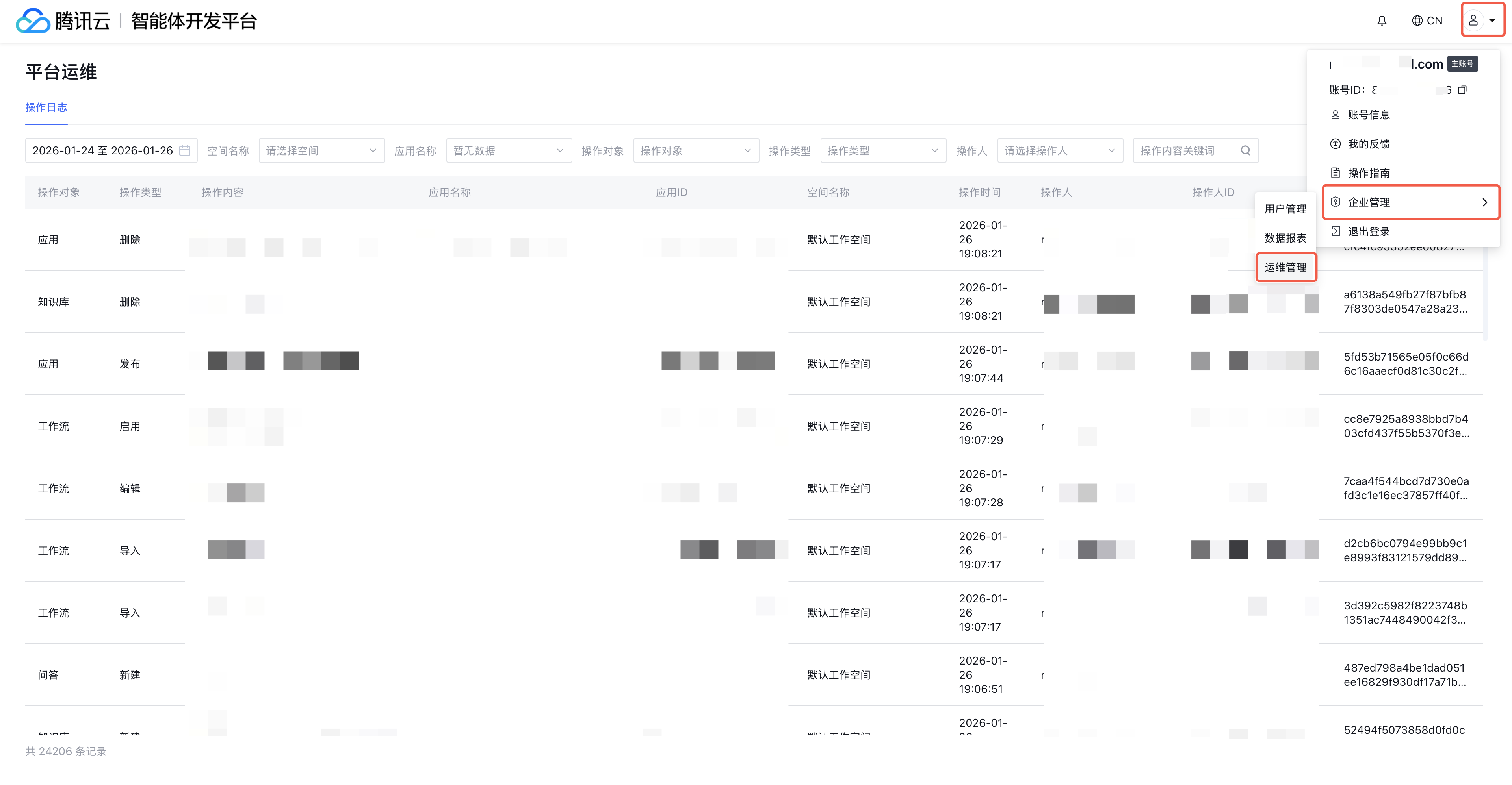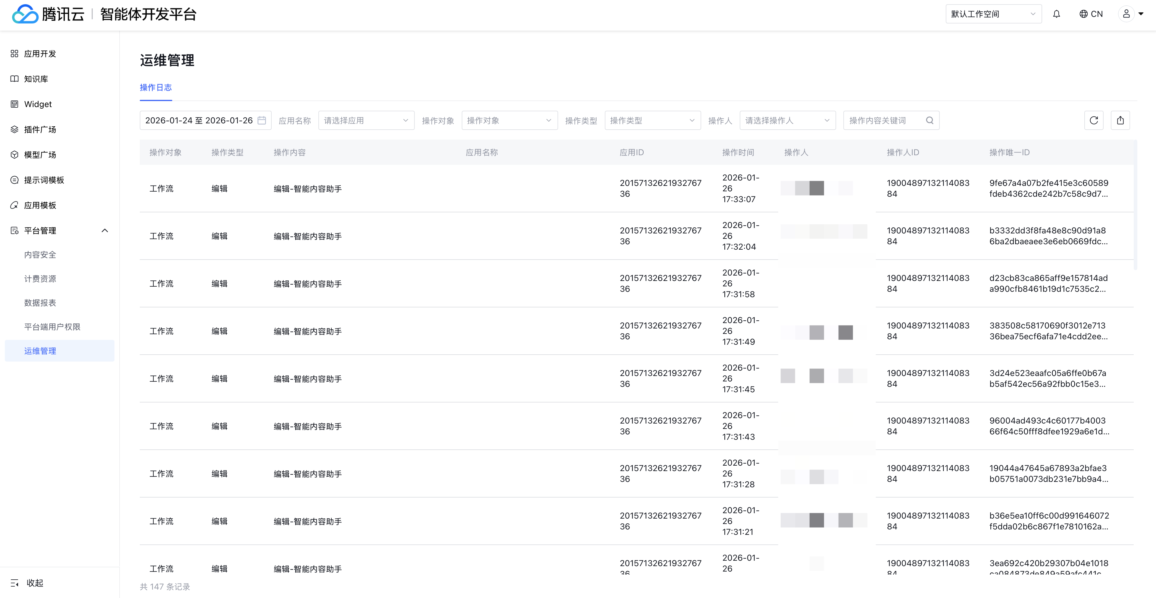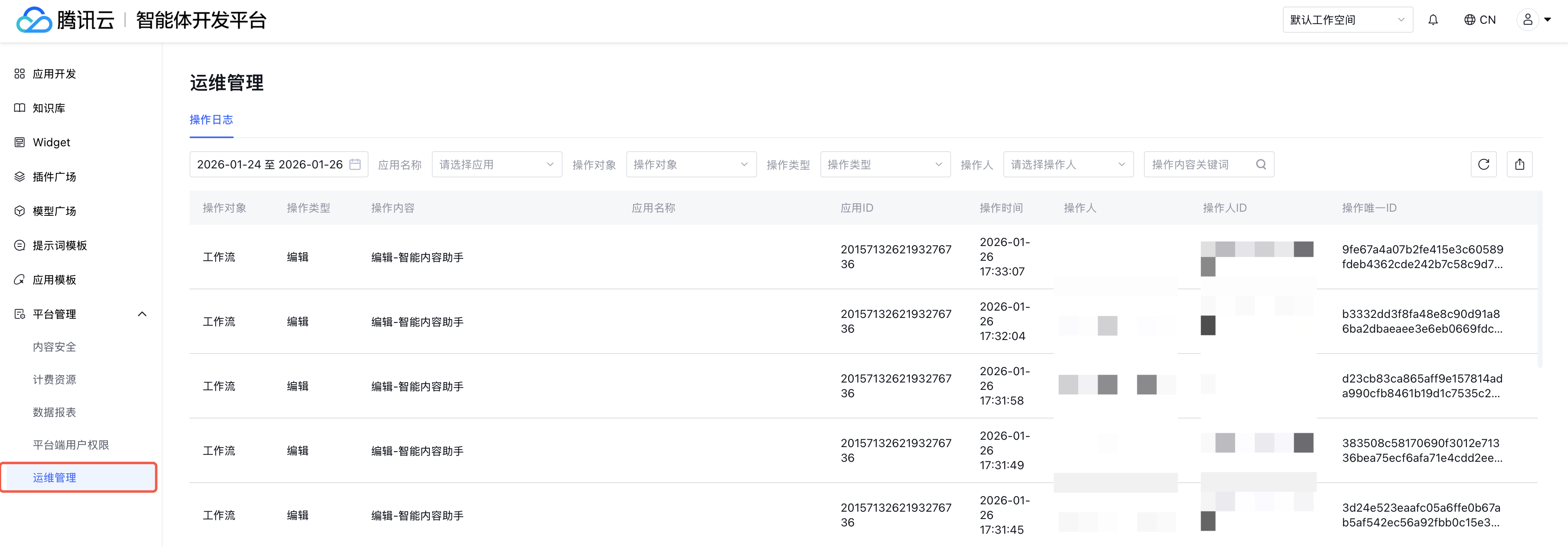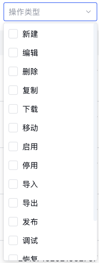 操作类型 | 支持筛选,包含的枚举值 如下: 新建:包括文件导入式创建。 编辑:编辑对应内容。包括批量编辑操作,比如批量调整文档的有效时间。 复制:比如应用开发的复制。 下载:包括批量下载动作。 删除:包括批量删除。 移动:将某一资产移动到对应分类。 启用:启用文档、问答等资产 停用:停用文档、问答等资产 导入:知识库文档导入等。 导出:报表数据导出等。 发布:发布应用。 调试:调试工作流的具体某一个节点或者调试整个工作流的操作。 恢复:恢复文档、问答等资产。 收藏:提示词模板收藏。 取消收藏:提示词模板取消收藏 | 支持下拉选择操作类型,多选 ![]() | 是 | 是 |