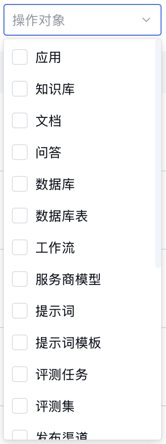 操作对象 | 操作对象包括: 应用 知识库 文档 问答 数据库 数据库表 工作流 服务商模型 提示词 提示词模板 评测任务 评测集 发布渠道 用户 权限 插件 应用运营-数据分析 应用运营-对话记录 应用运营-拒答问题 应用运营-不满意问题 计费 运维 | 支持下拉选择操作类型,多选 ![]() | 是 | 是 |