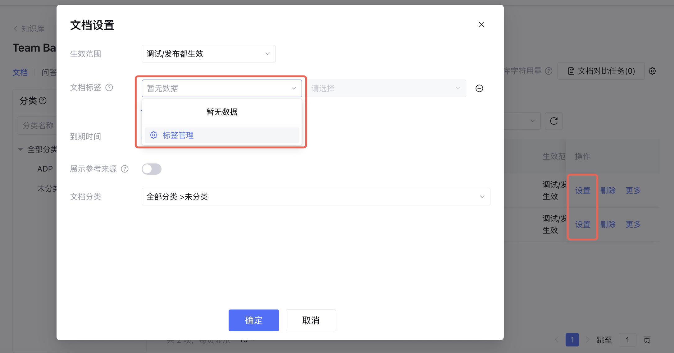进入知识库后,单击设置,进入文档标签下拉的标签管理。