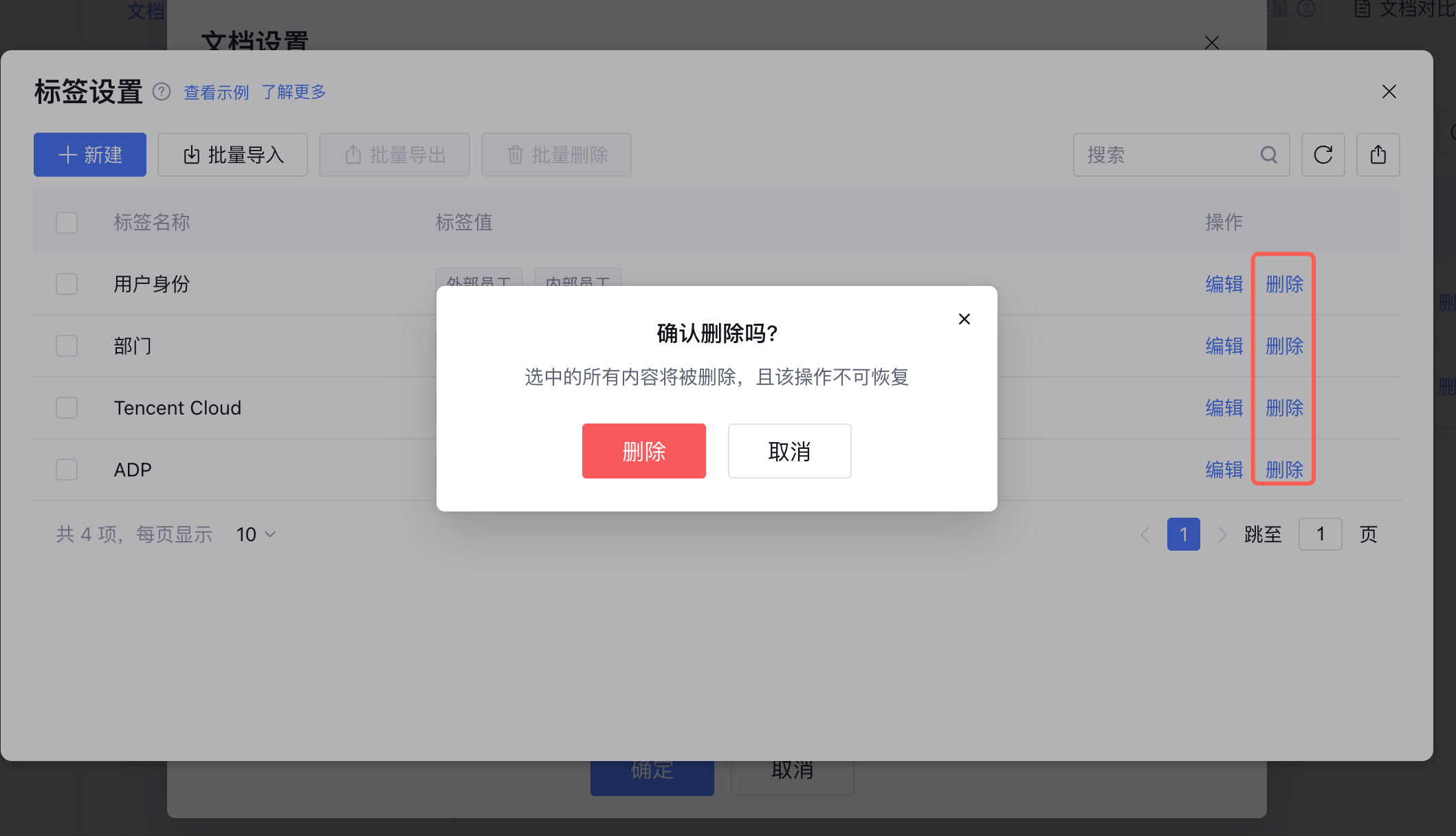 支持逐个删除和批量删除标签。当标签被文档/问答使用后,不支持删除。