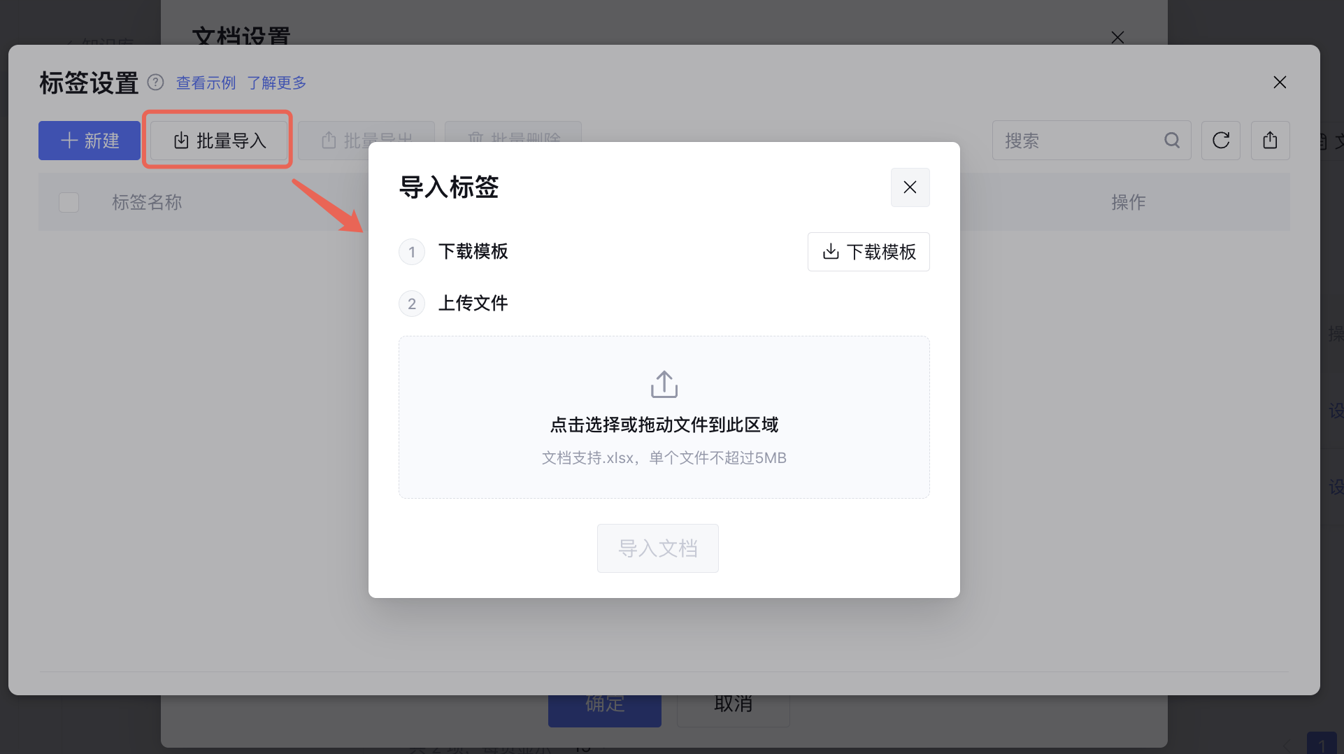 单击下载模板,下载后根据文件内指引填写标签内容,填写完成之后,通过文件上传,单击导入文档,将标签批量导入标签管理。