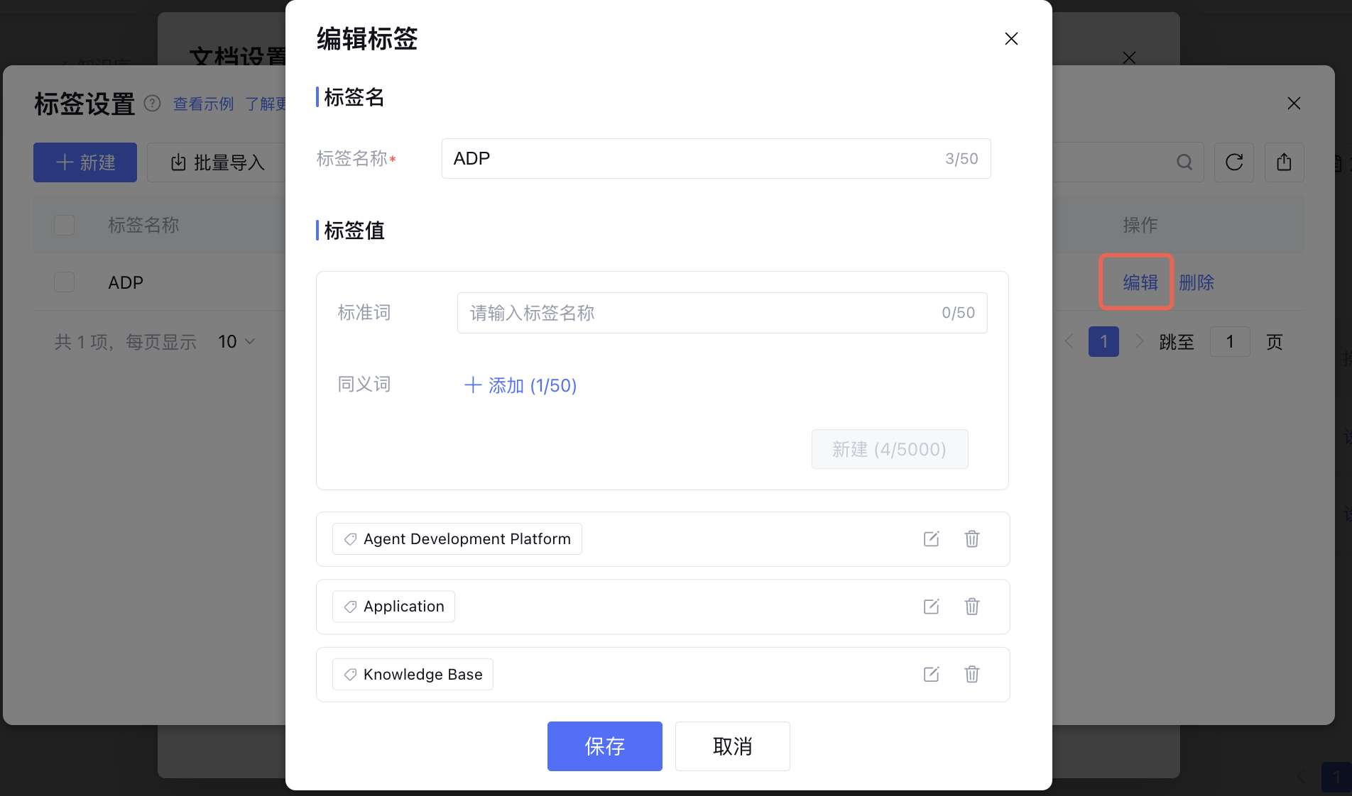 点击编辑进入编辑标签页面,支持修改标签名称和标签值。如修改的标签被文档/问答使用,需要发布后在发布环境中生效。