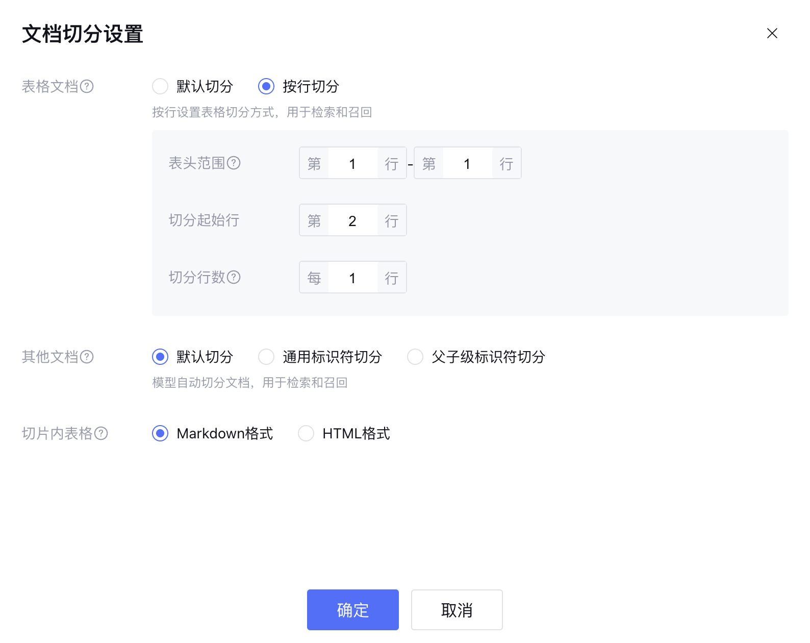 子级切片用于知识检索,检索到对应的父级片段后用于大模型召回 | 支持用户设置表头范围、数据切分起始行以及切分行数。系统将表格文档按照设置的切分行数切分成片段。 |