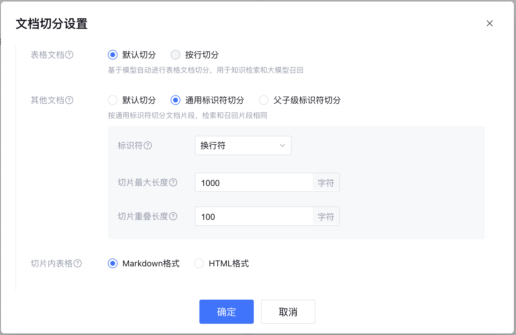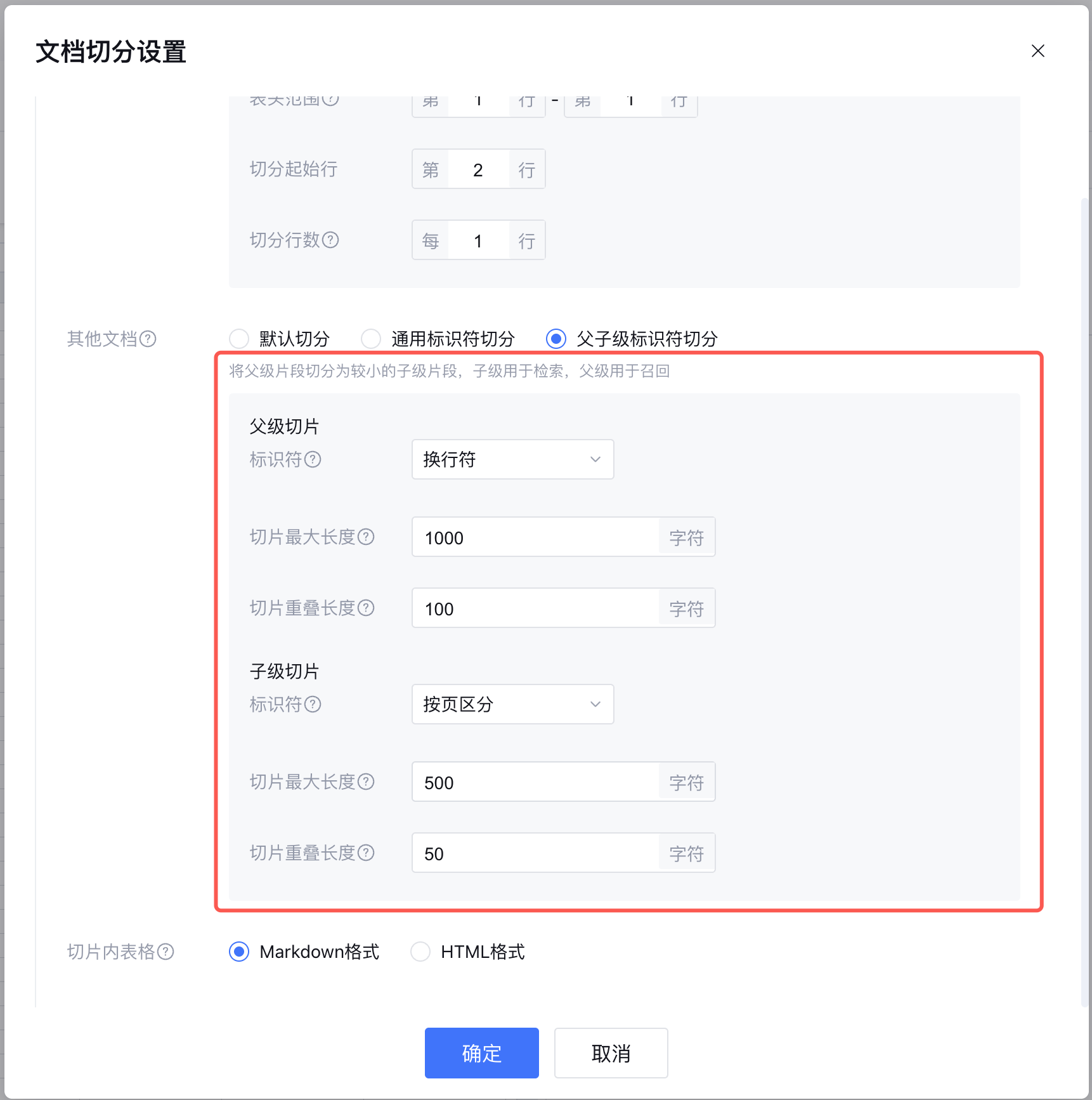 | 父级和子级切片分别支持用户设置标识符、切片最大长度、切片重叠长度。