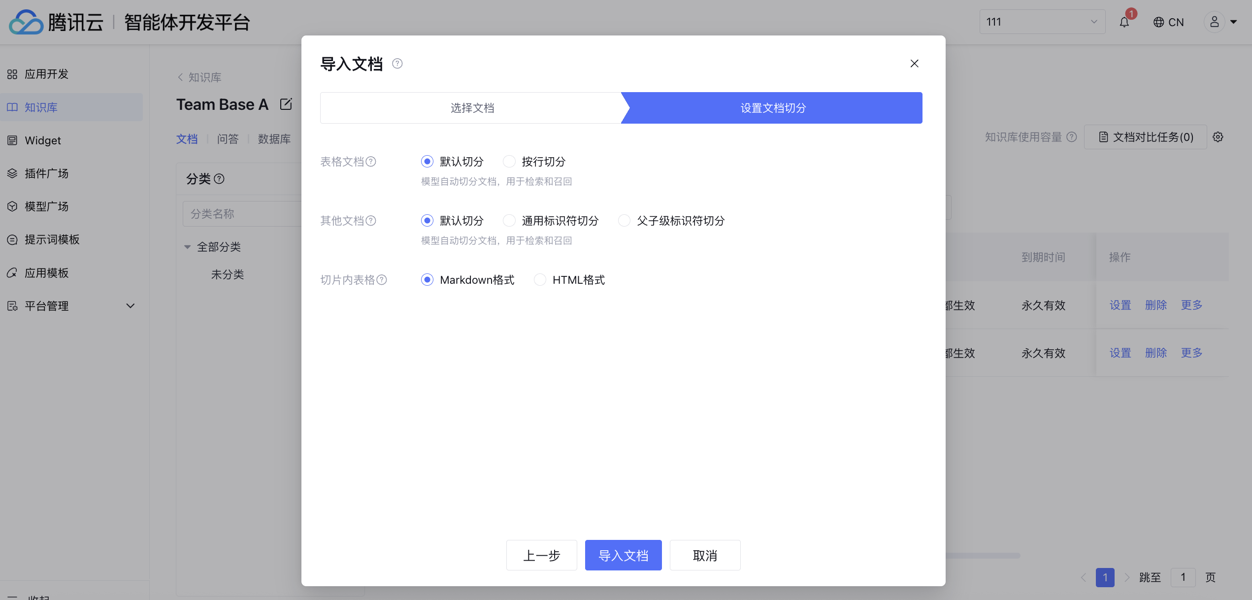 产品上使用“切分模型”基于表格行数、语义完整性等进行切分。