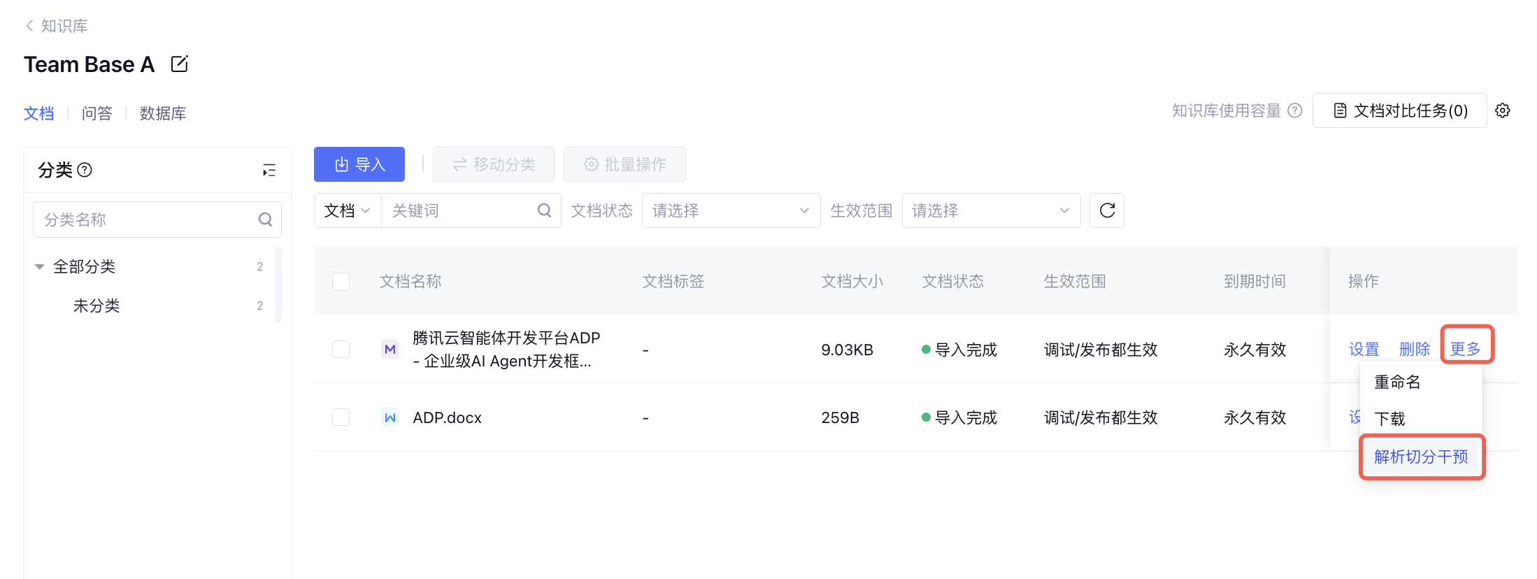 入口2 - 重新调整已有文档的切片规则:已导入的文档可重新设置文档切分,依次点击知识库中指定文档右侧的更多 > 解析切分干预,可查看解析切分的结果并可通过单击文档切分设置重新设置切分规则。
