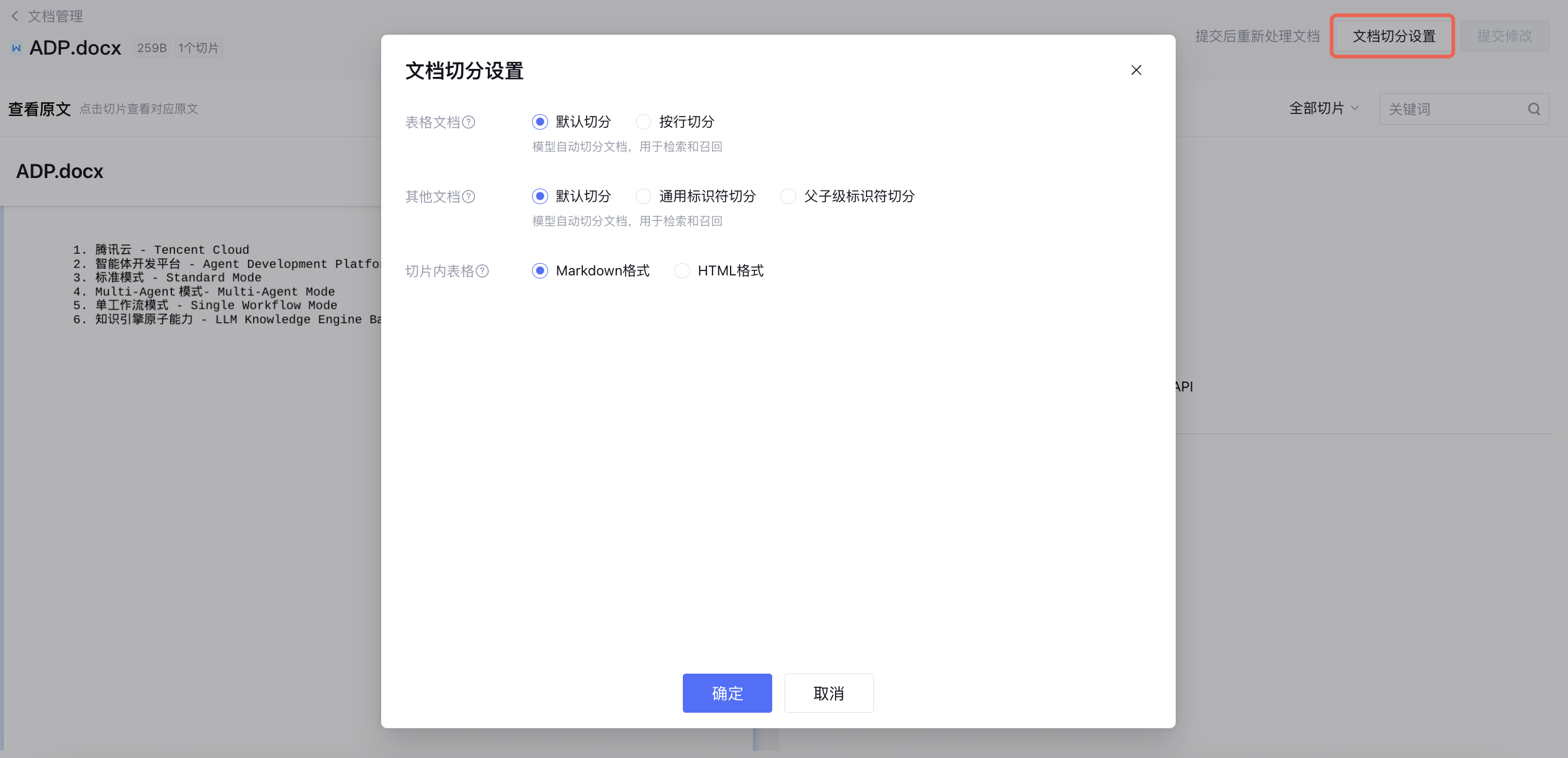 支持设置默认切分、通用标识符切分、父子级标识符切分,设置后对非表格类的文档生效,知识库中除了 xlsx、xls、csv 以外的文档类型。