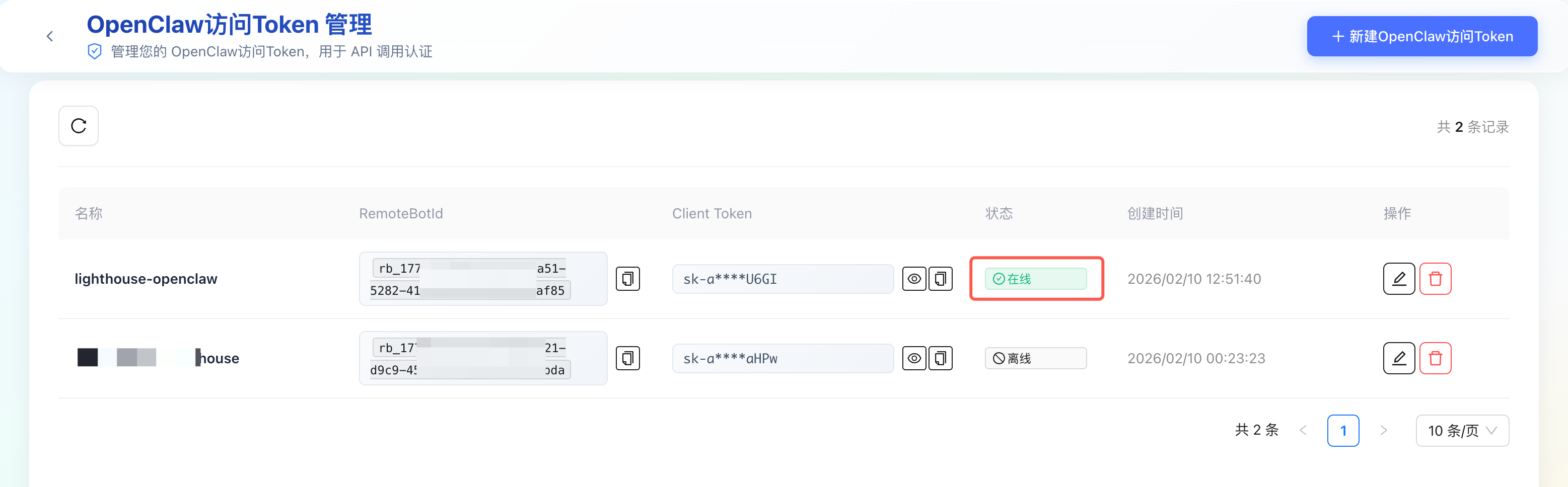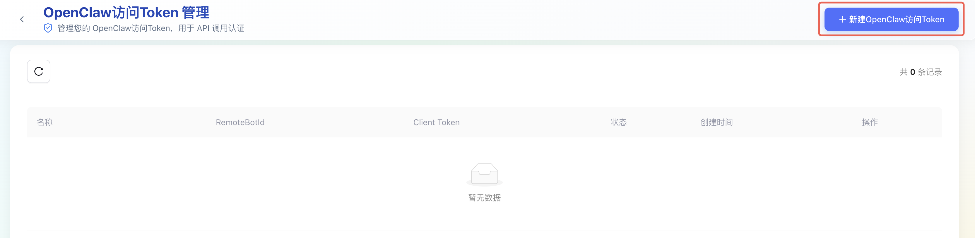 2. 在弹出的管理页面中,单击新建 OpenClaw 访问 Token。