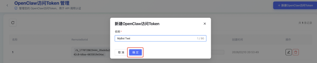 3. 阅读并同意用户协议后,输入 OpenClaw 访问 Token 名称,单击确定。