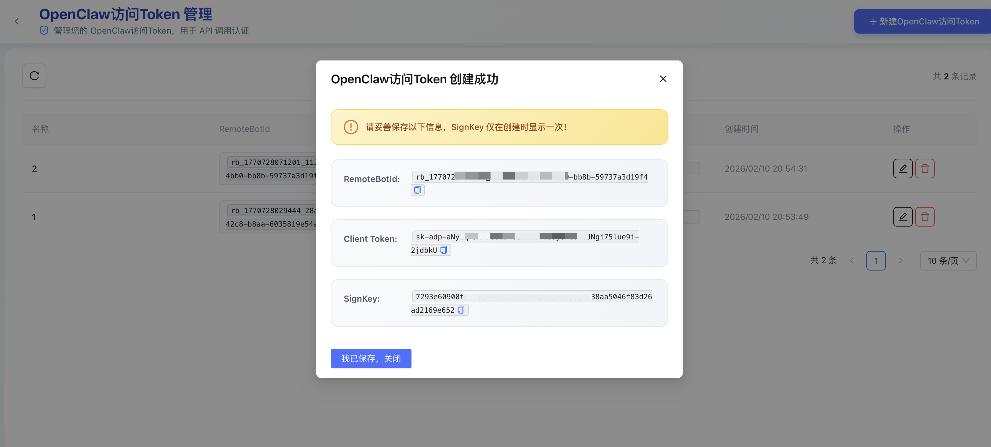 4. 创建成功后,系统会生成 RemoteBotId、Client Token 和 SignKey。