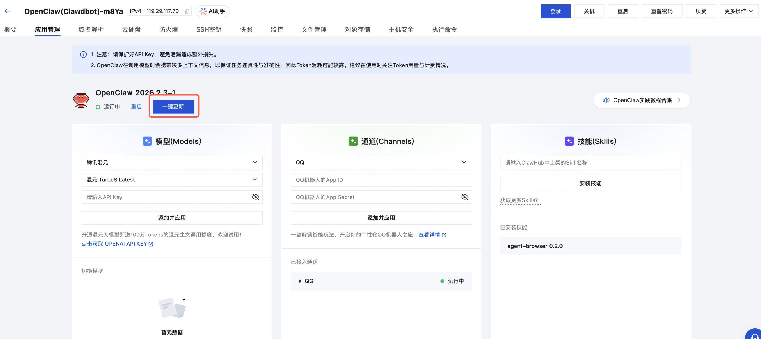1. 点击一键更新对 OpenClaw 服务进行更新。