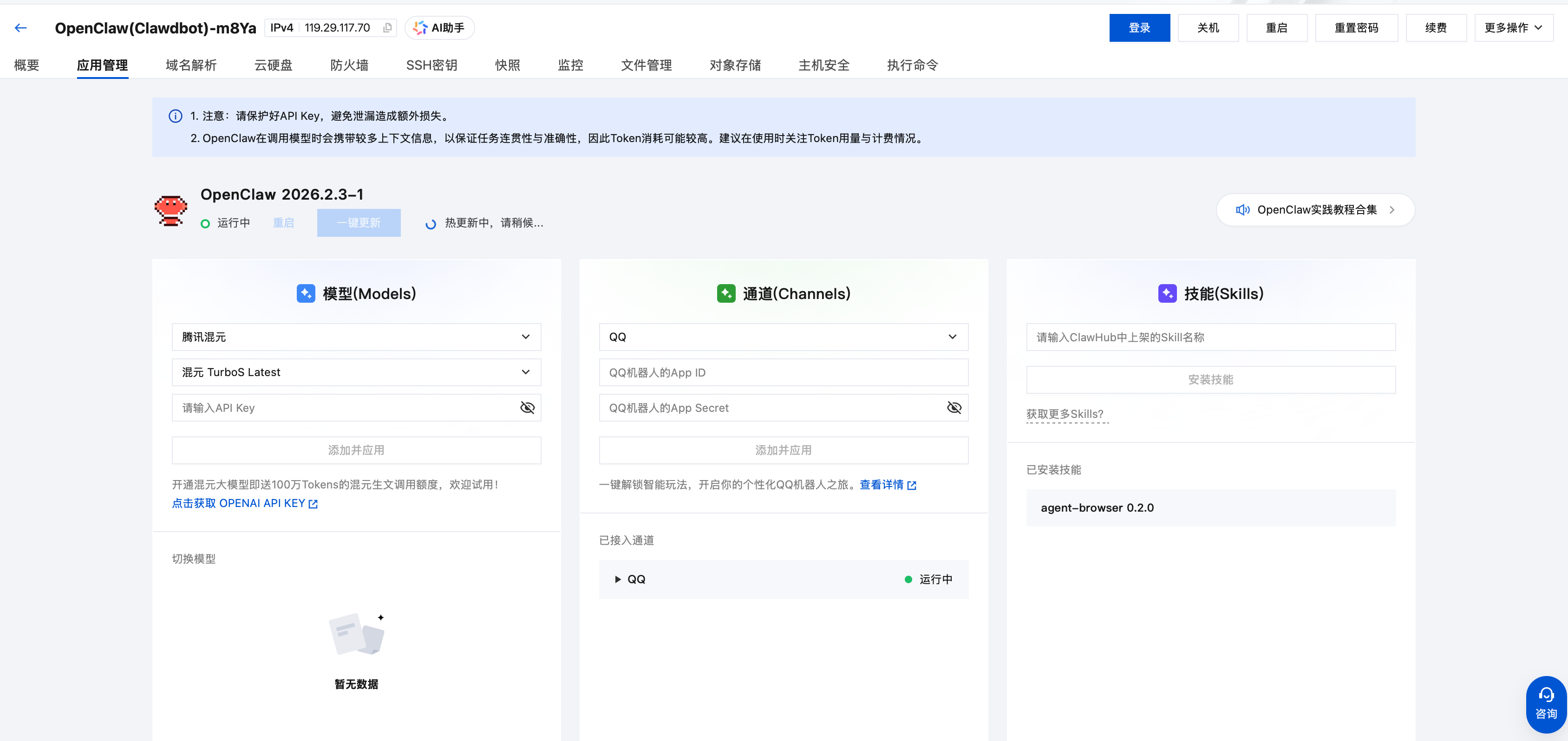4. 配置完成后,在腾讯云智能体开发平台的 OpenClaw 访问 Token 管理页面,查看对应的 OpenClaw 状态显示为“在线”,说明配置成功。OpenClaw 模型配置和通道配置都完成之后,在腾讯云智能体开发平台上的应用可以开始接入 OpenClaw 的插件处理用户请求了。