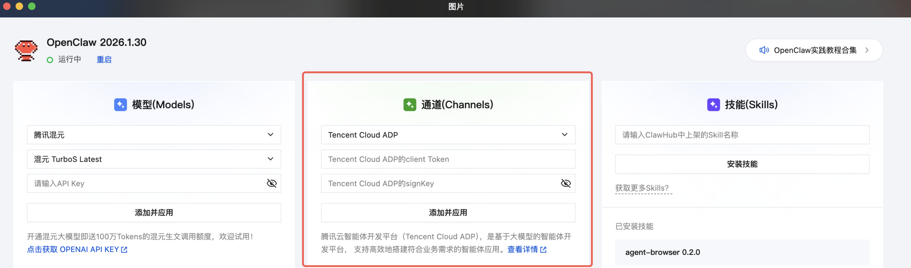 3. 更新完成后,进入“应用管理”页签,在“ Channel 配置”输入框,选择“ Tencent Cloud ADP ”并输入在前面步骤中获取的 RemoteBot 的 ClientToken 和 SignKey ,并单击添加并应用,等待几十秒后页面提示“保存成功”即完成配置。