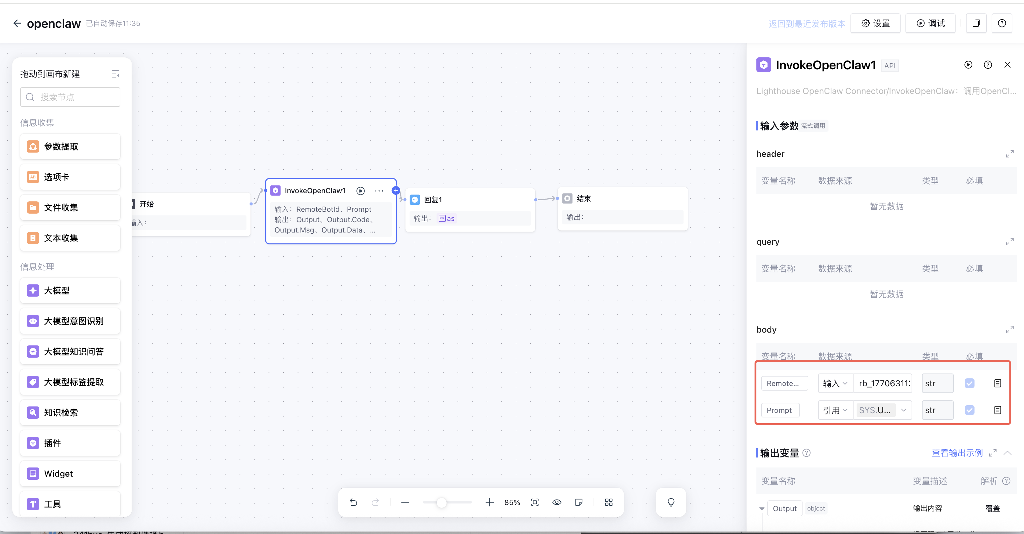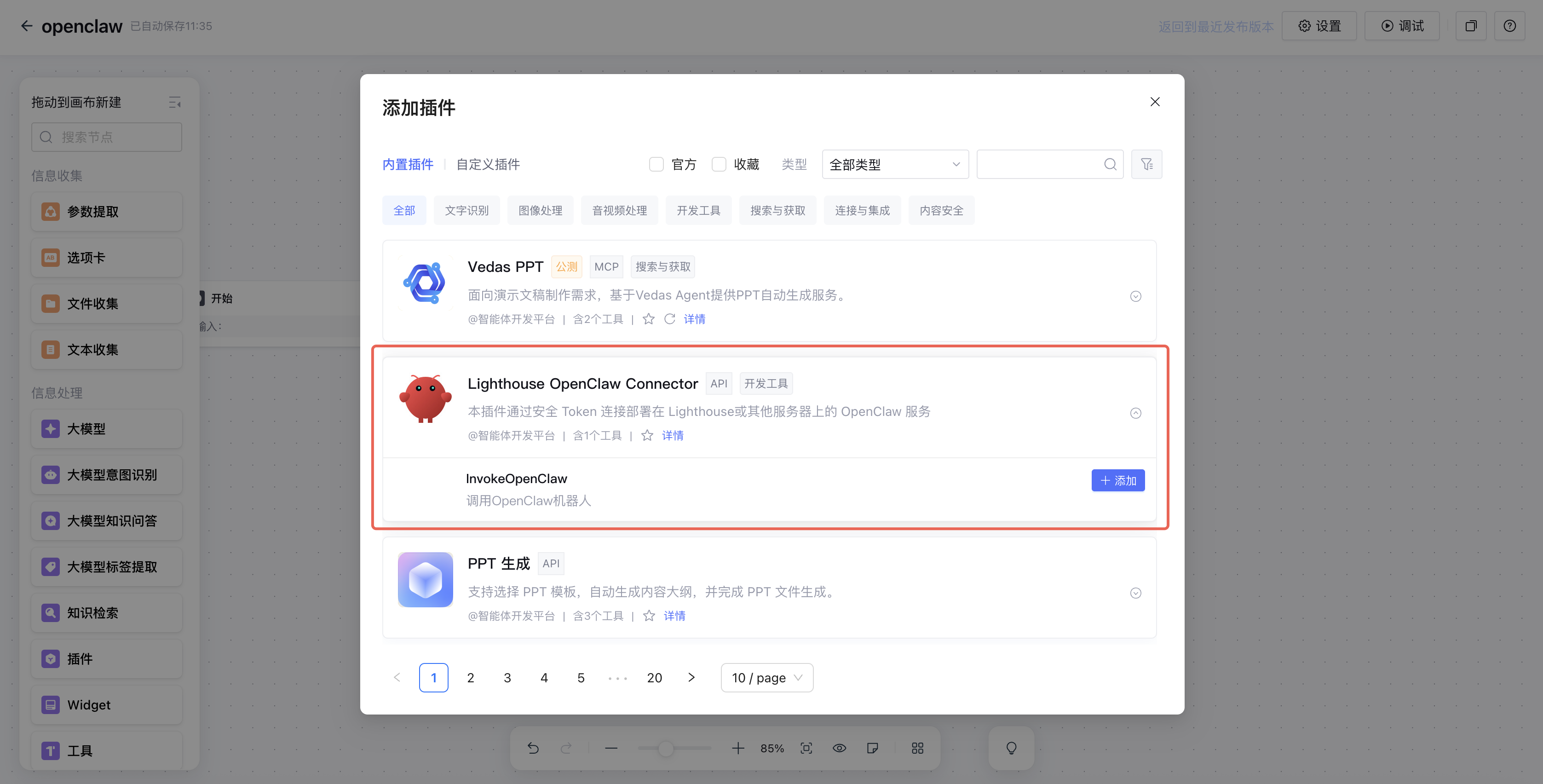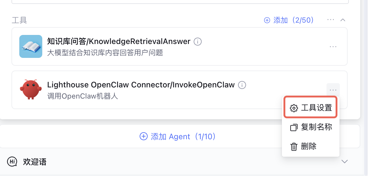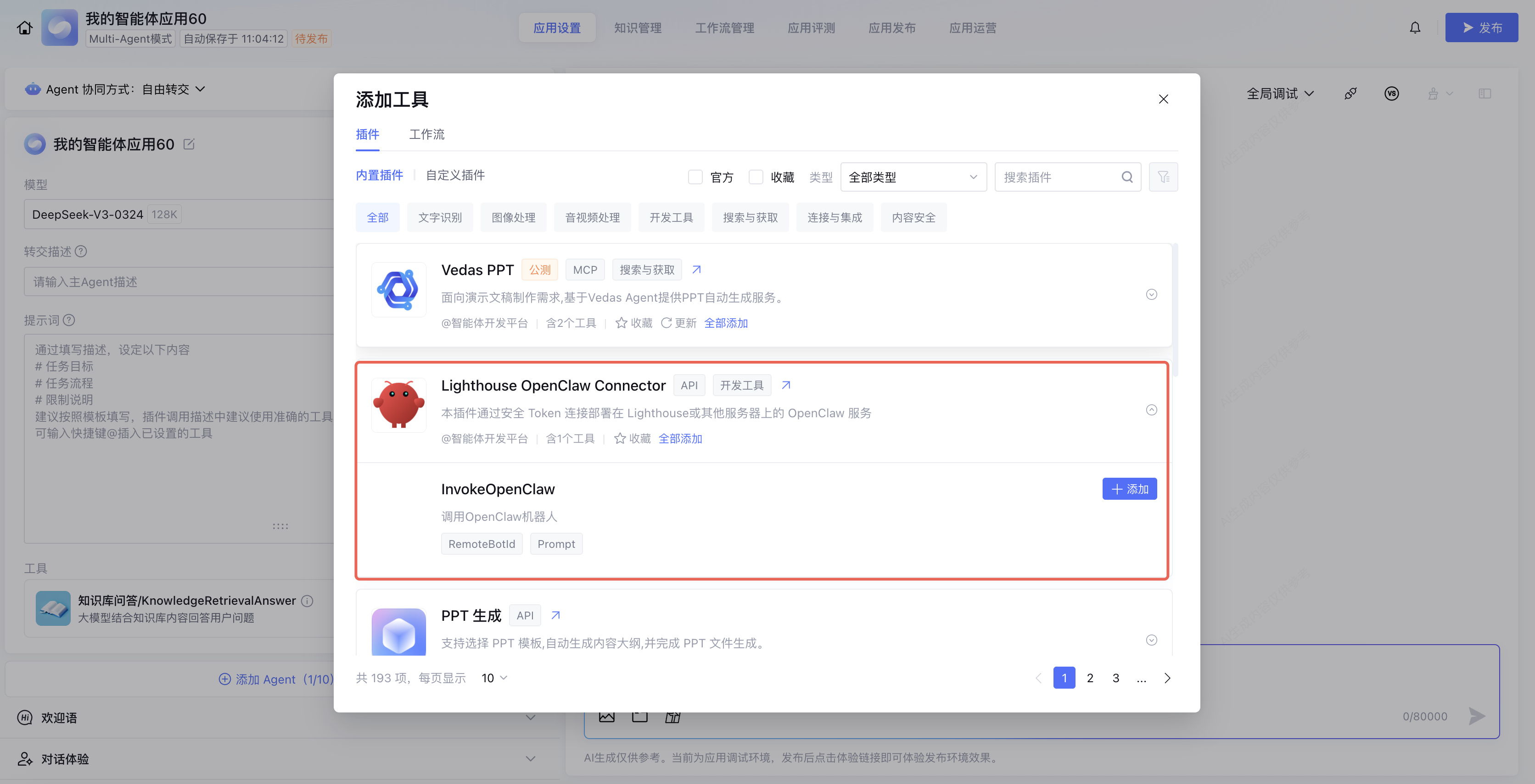 2. 添加 Lighthouse OpenClaw Connector 插件的 InvokeOpenClaw 工具。