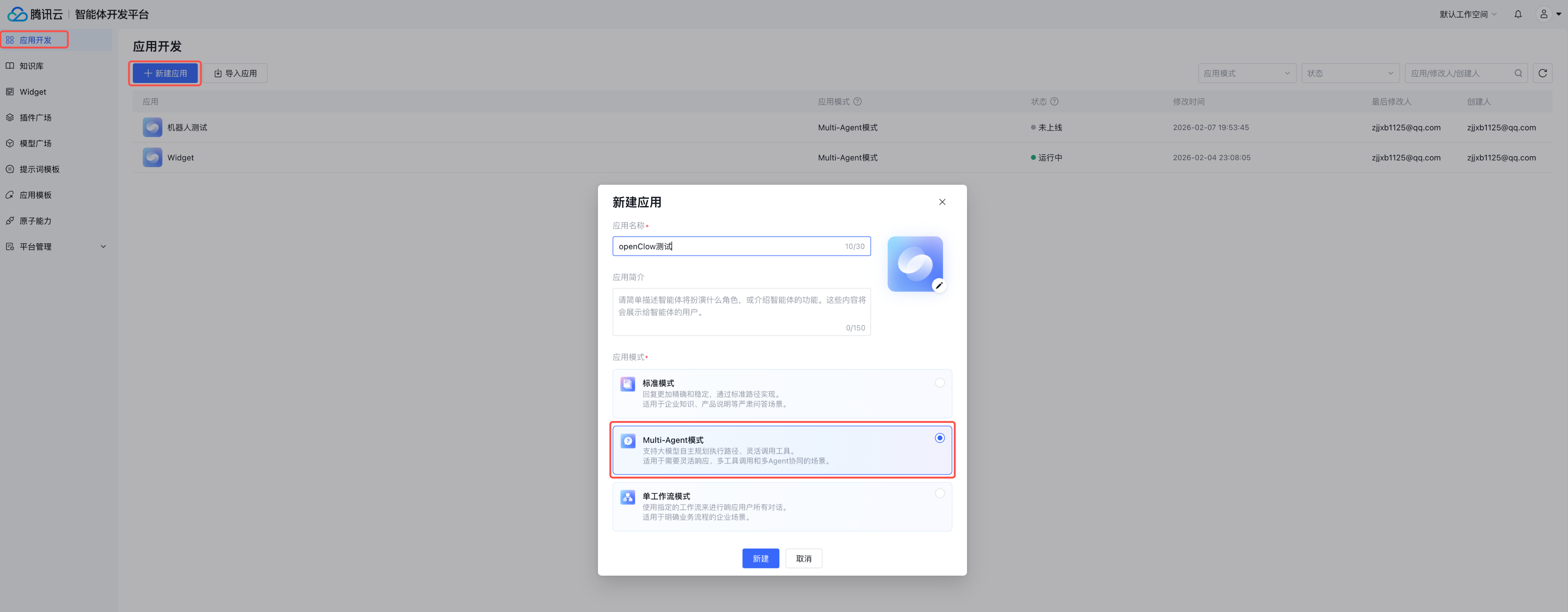登录腾讯云智能体开发平台,新建一个 Multi-Agent 模式的应用。