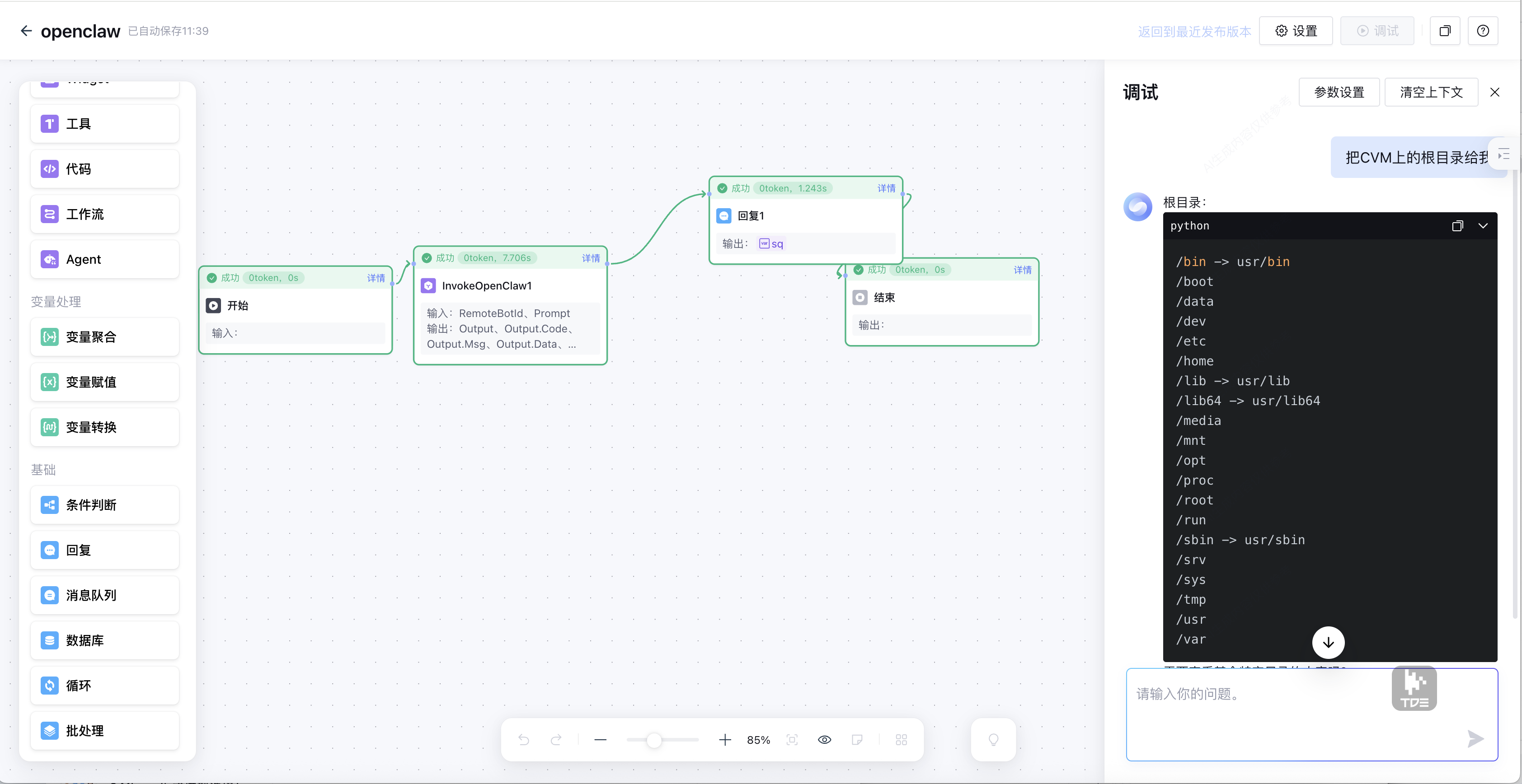 1. 在右侧预览调试窗中,输入相关指令(例如:“把 CVM 上的根目录列表发给我?”或具体的自动化任务指令)。