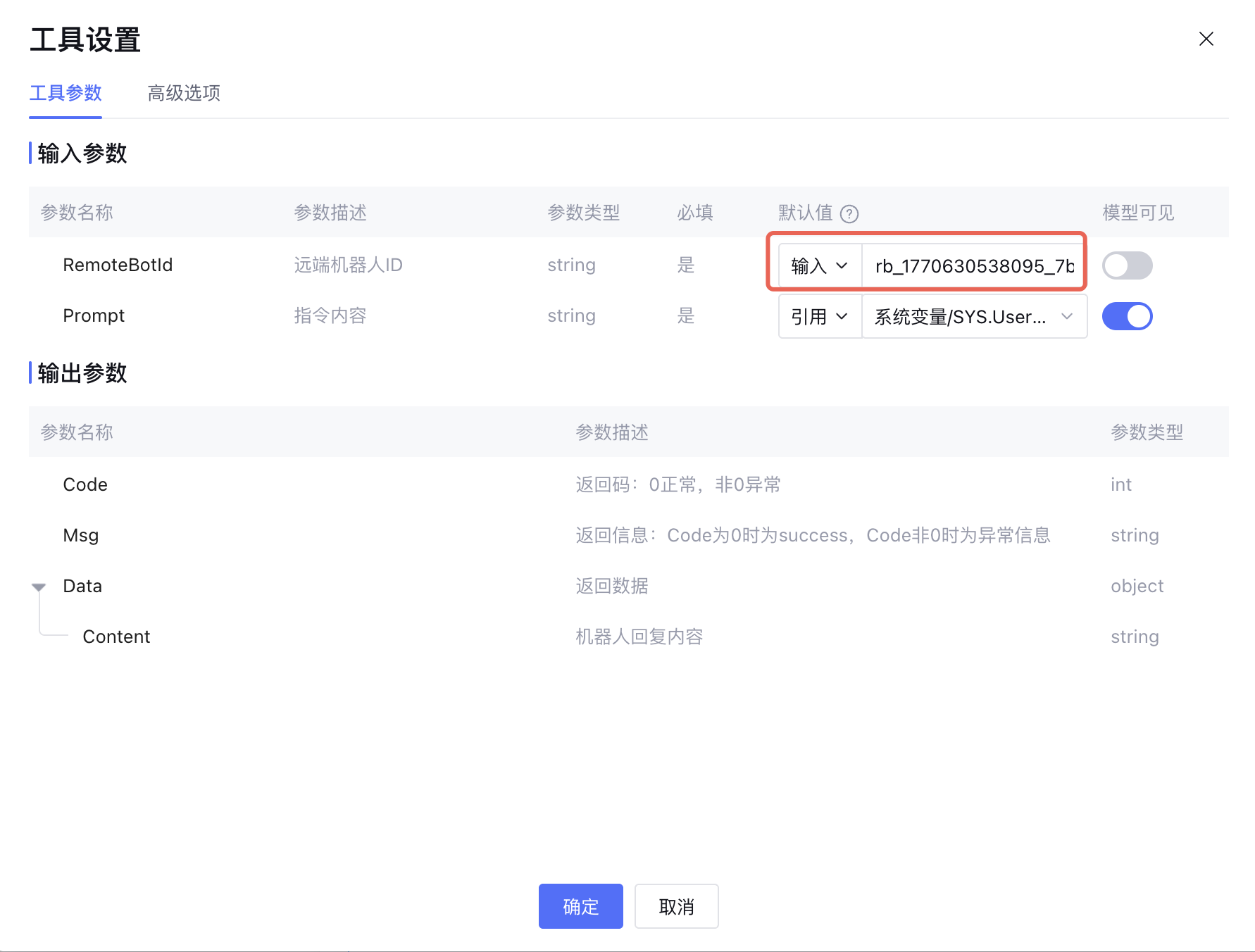 建议将 RemoteBotId 的 “模型可见” 开关设置为关闭状态,避免模型产生混淆,仅透传参数。