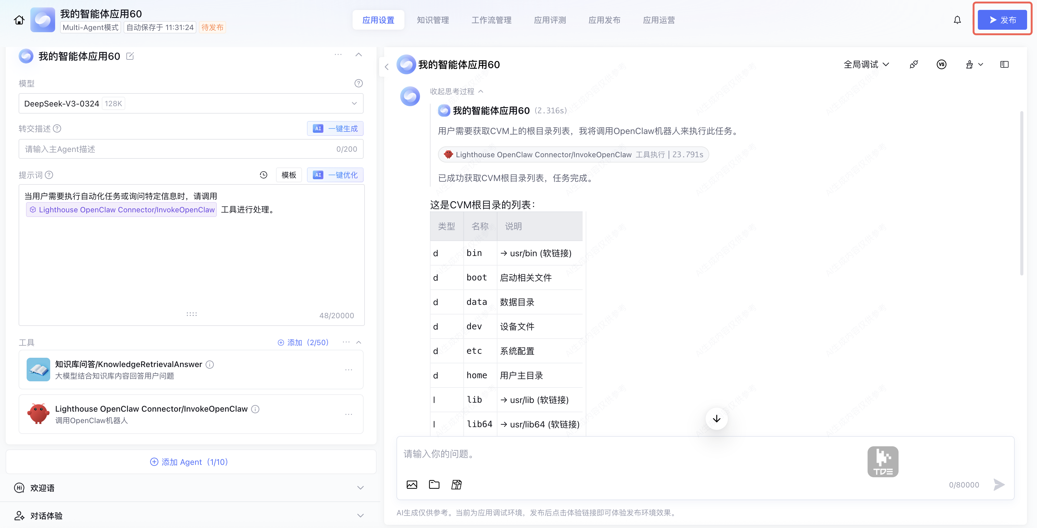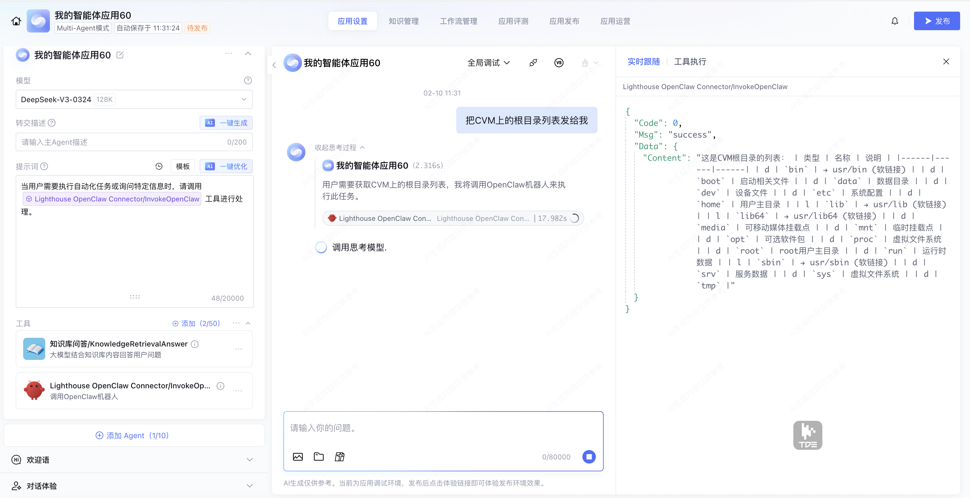 第五步:在腾讯云智能体开发平台中调用 OpenClaw