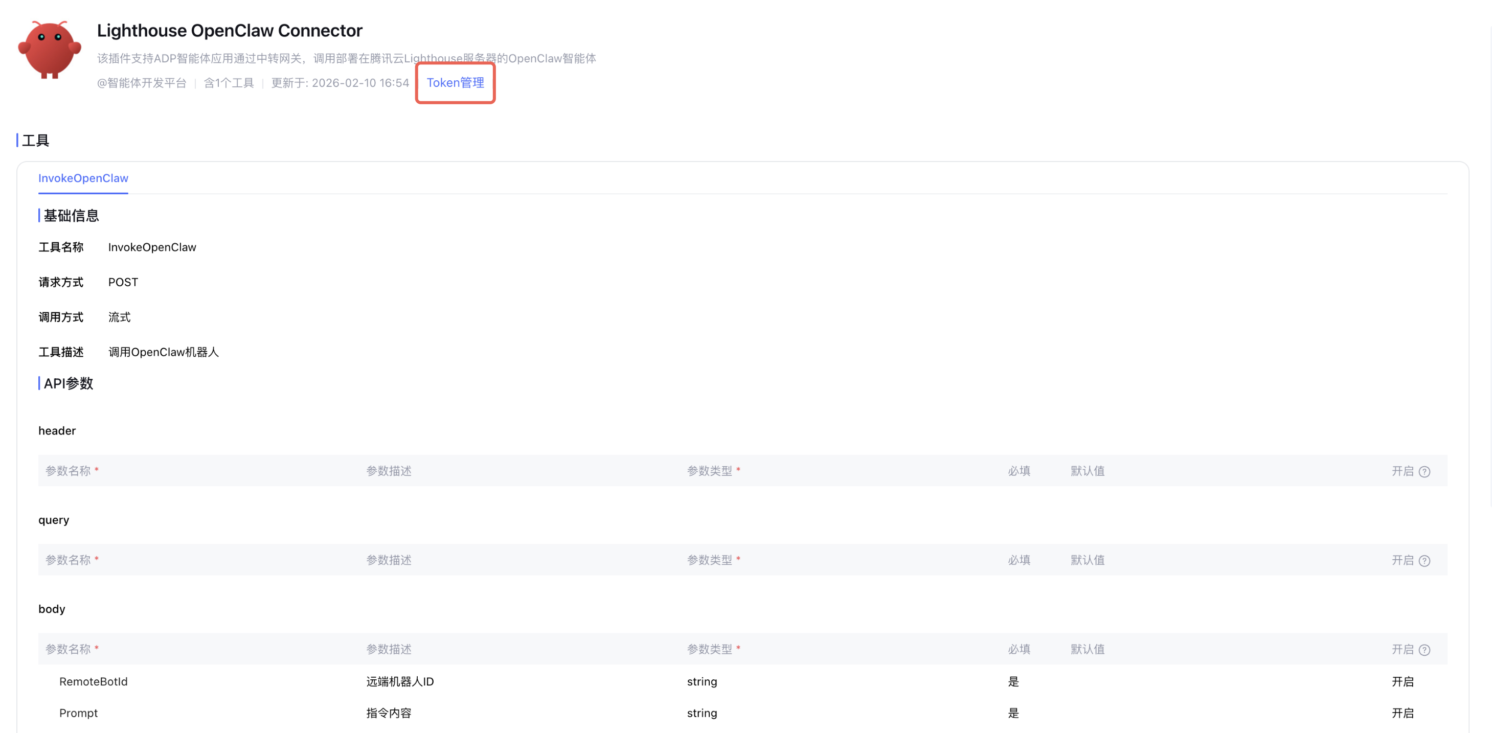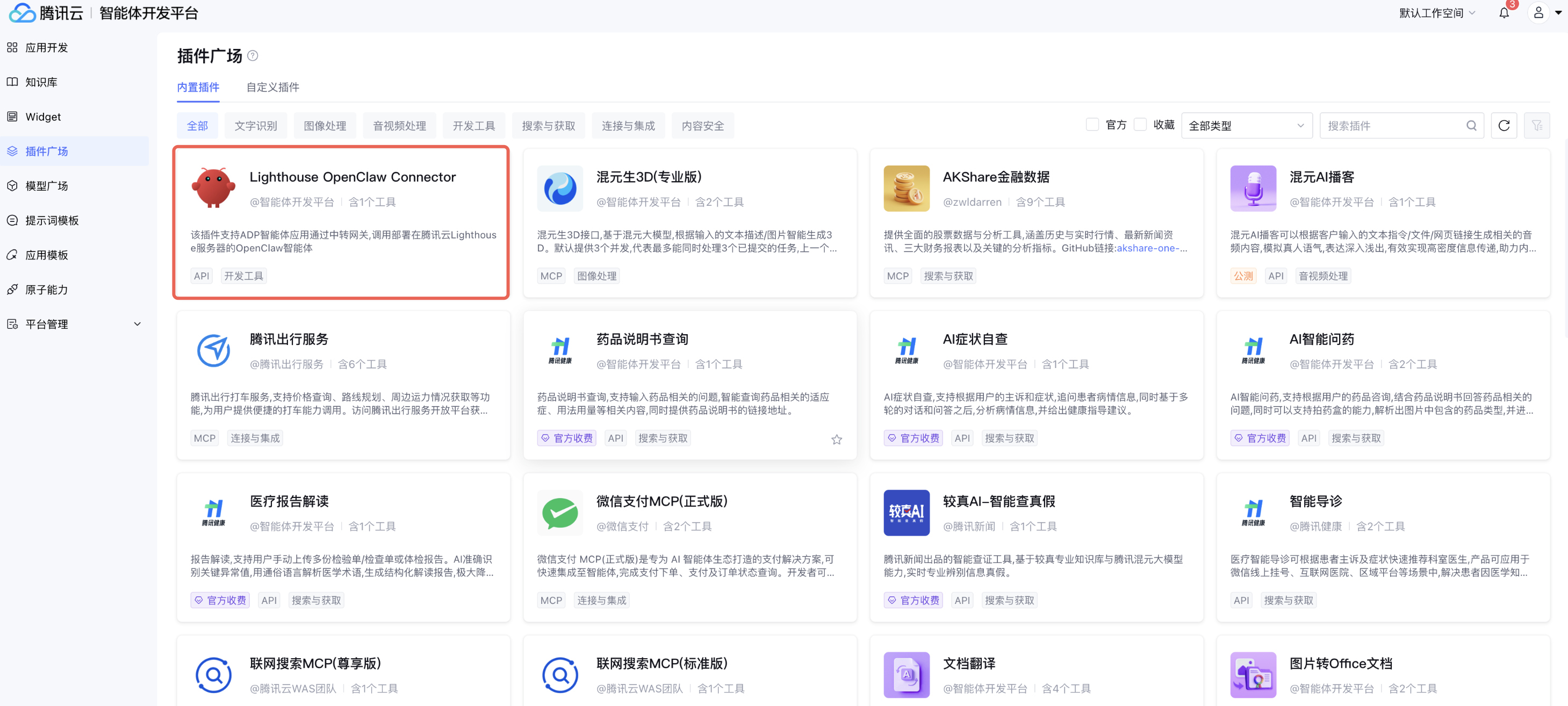 第二步:在腾讯云智能体开发平台中找到 Lighthouse OpenClaw Connector 插件