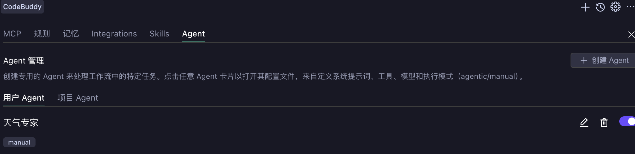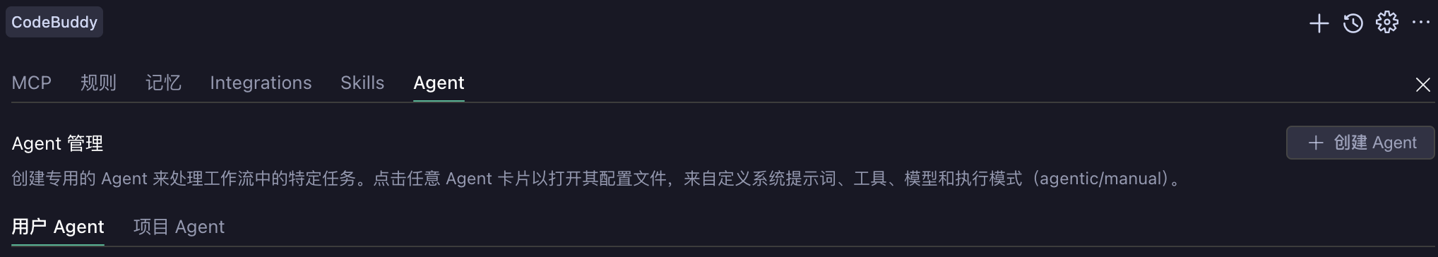 在 CodeBuddy IDE 中存在两种模式,分别是 agentic 和 manual,他们都会在设置页中 Subagents 名称的后面展示出来。