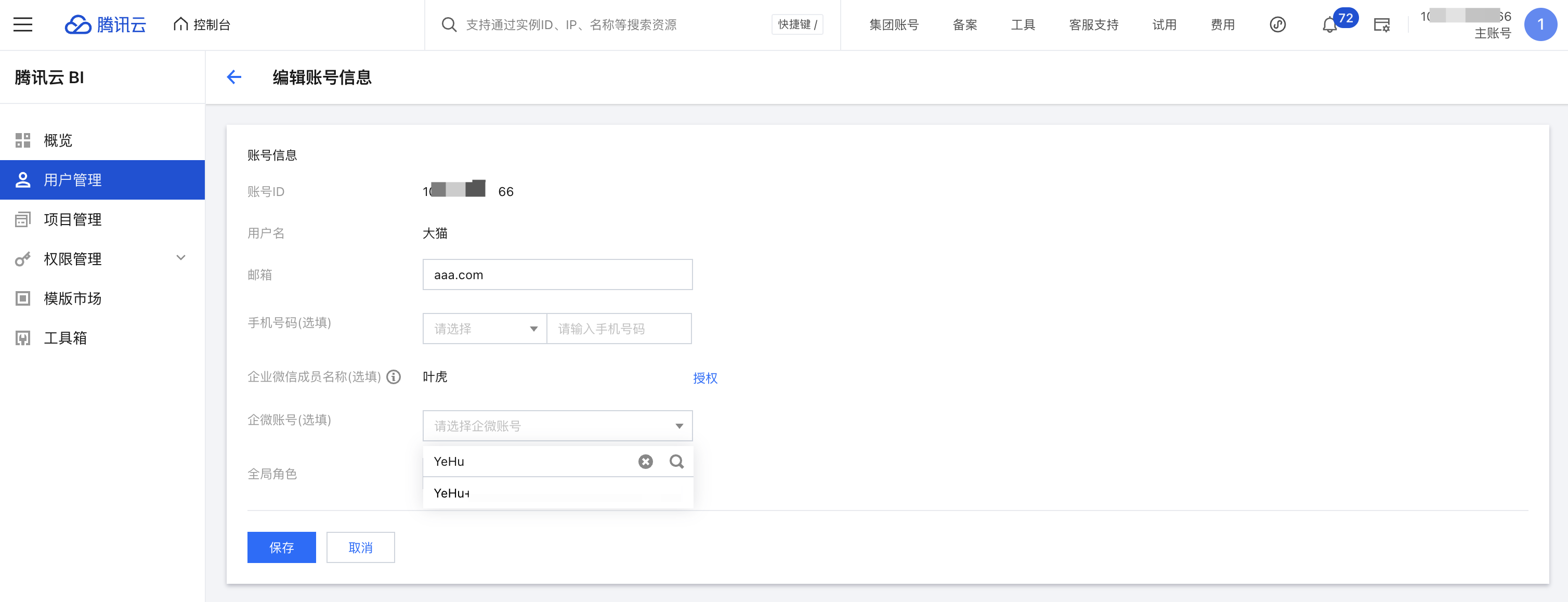 2. 进入BI 控制台 > 用户管理 > 用户列表 > 编辑: 输入企微完整账号搜索,并选择用户,保存。