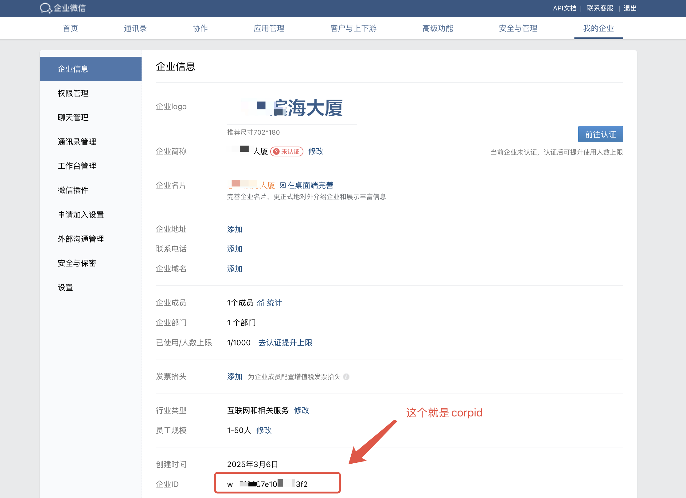 2. 进入 企微管理后台 > 我的企业 > 企业信息 ,找到企业ID: 3. 复制企业 ID 信息备用。