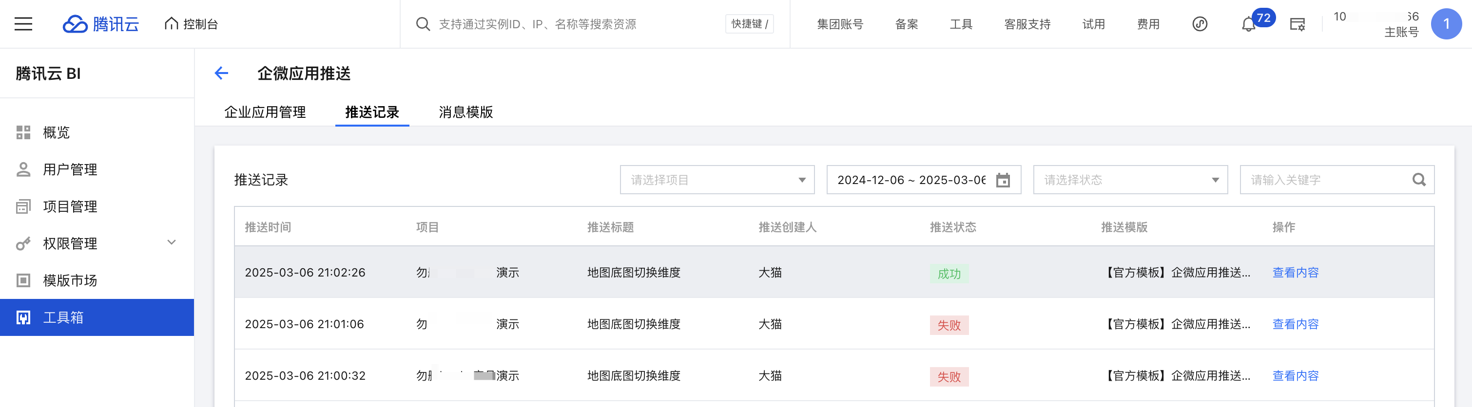进入推送记录,可查看所有企微应用推送的结果,用户也可以根据项目、状态或标题关键字进行筛选:
