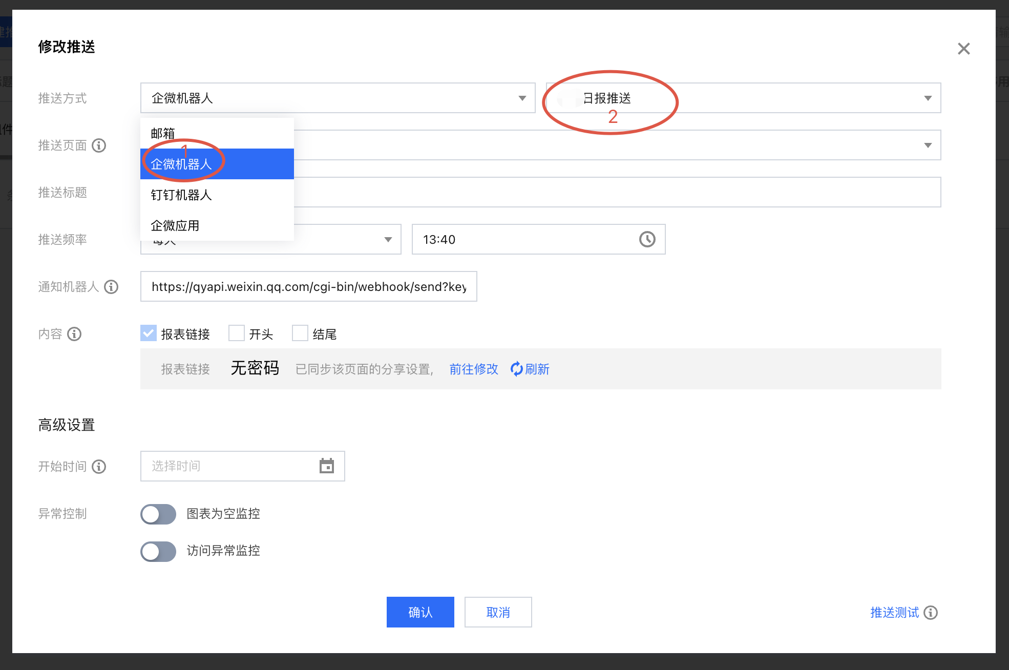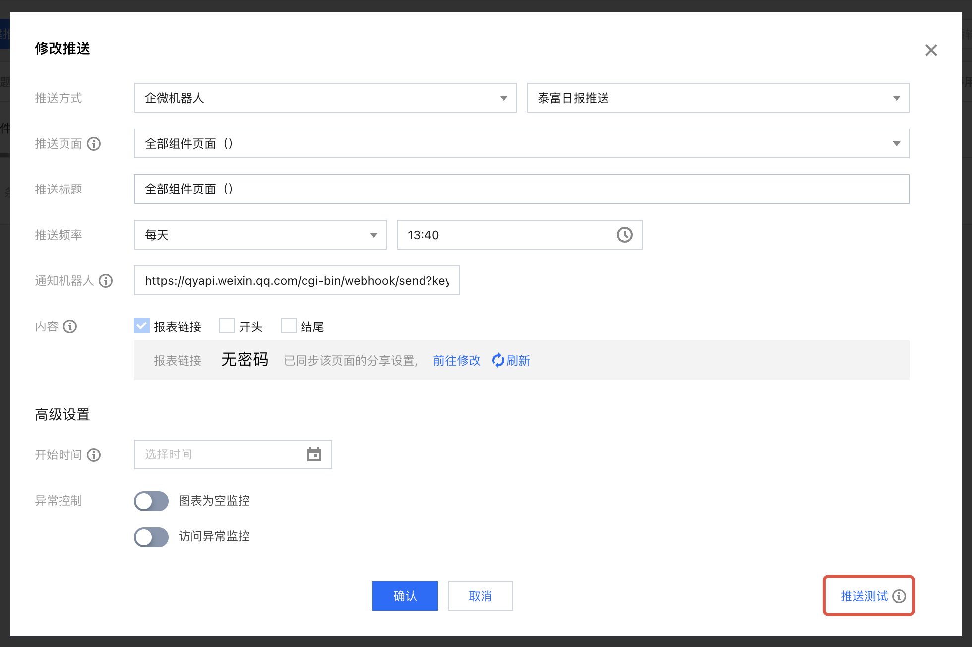 高级设置-异常控制-访问异常监控 | 设置图表访问报错时的处理方式,包含以下可配置项: 1、异常范围:包含全部图表异常和部分图表异常 2、出现异常的处理:可选暂停当次推送(取消勾选会忽略异常,直接推送) 及 发送告警(勾选后为空时会发送告警给通知机器人) | 可同时选择 告警 和 暂停推送 |