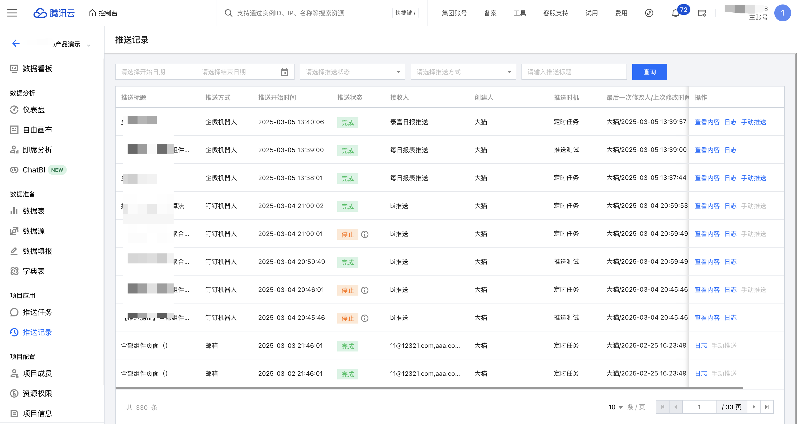 用户可以在 推送记录 里查询当前项目已推送的情况。